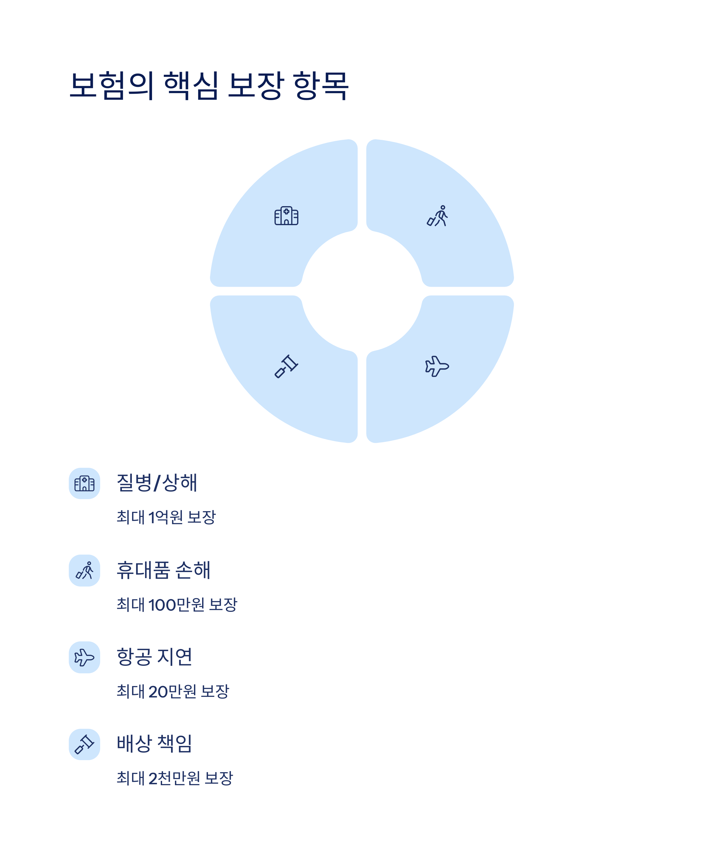 | 질병/상해 치료 | 해외 병원 진료비 및 입원비 | 최대 1억원 |