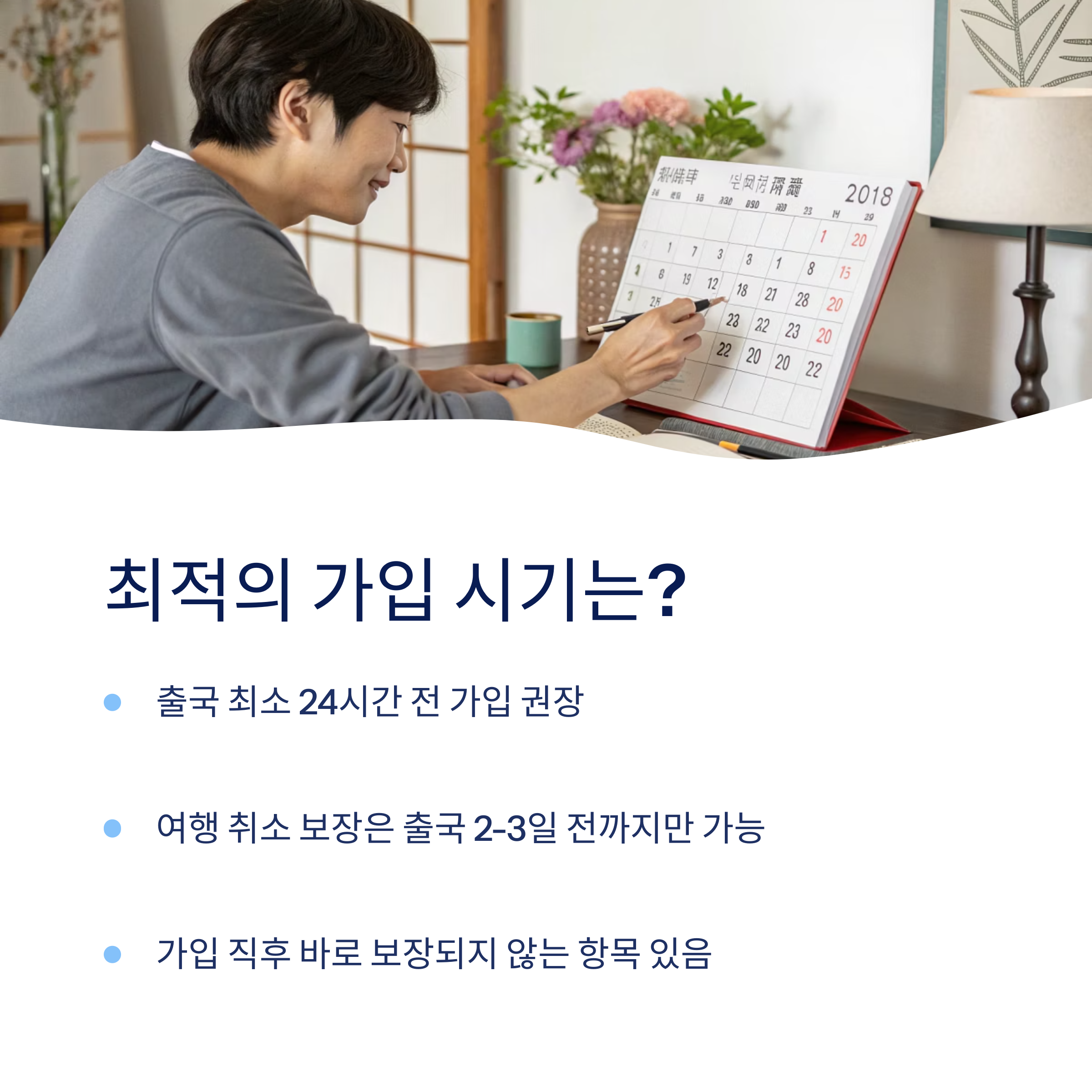 예를 들어 ‘여행 취소 보장’은 출국일 기준 2~3일 전까지만 가입할 수 있도록 제한된 상품도 있어요. 너무 늦게 가입하면 아예 해당 보장이 빠져버릴 수 있다는 거죠. 😲