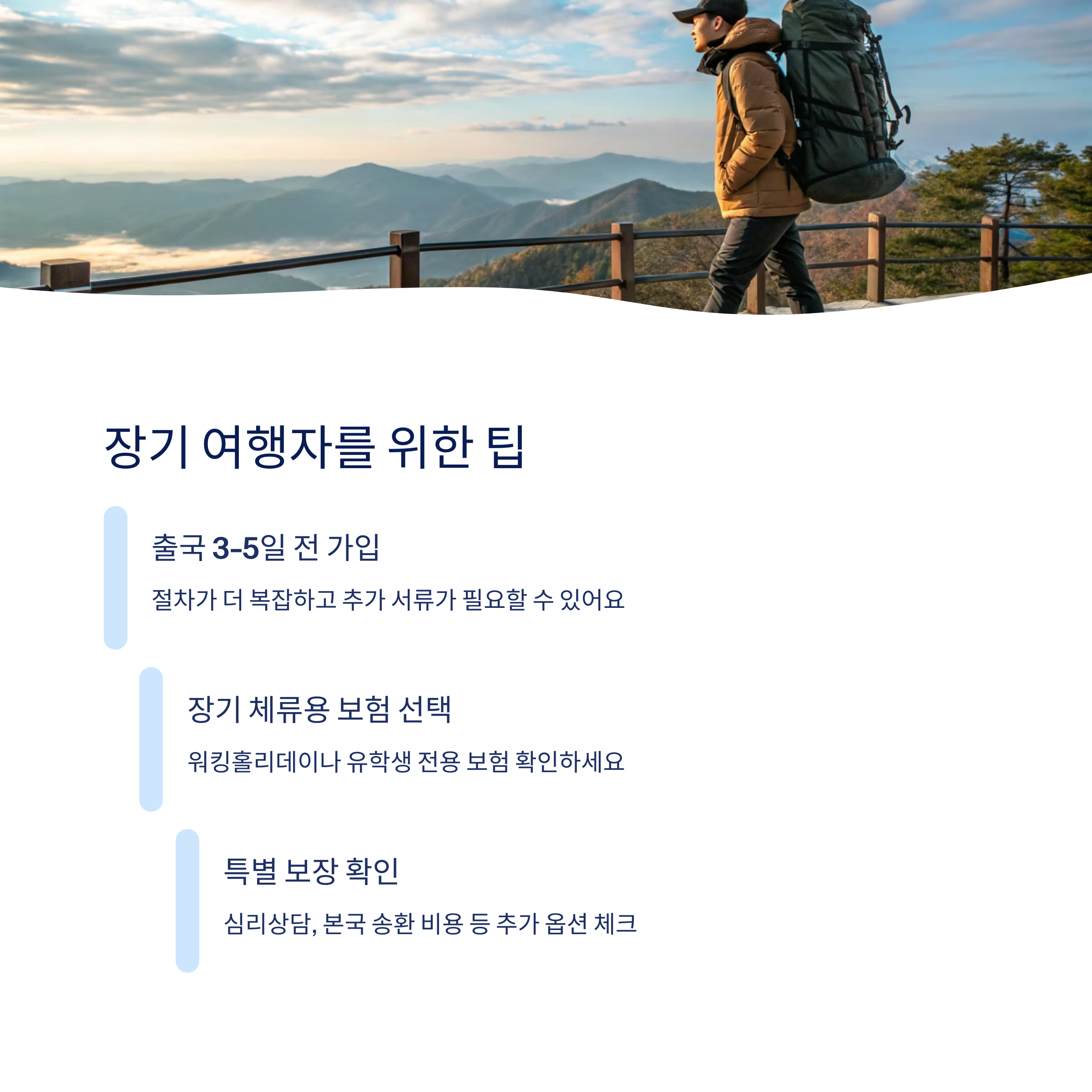 배낭여행이나 워킹홀리데이, 유학처럼 몇 달 이상 해외에 머무는 경우라면 단기 여행자 보험으로는 커버가 어려워요. 이때는 '장기 체류용 여행자 보험'이나 '유학생 보험'처럼 목적과 기간에 맞는 상품을 가입해야 해요.