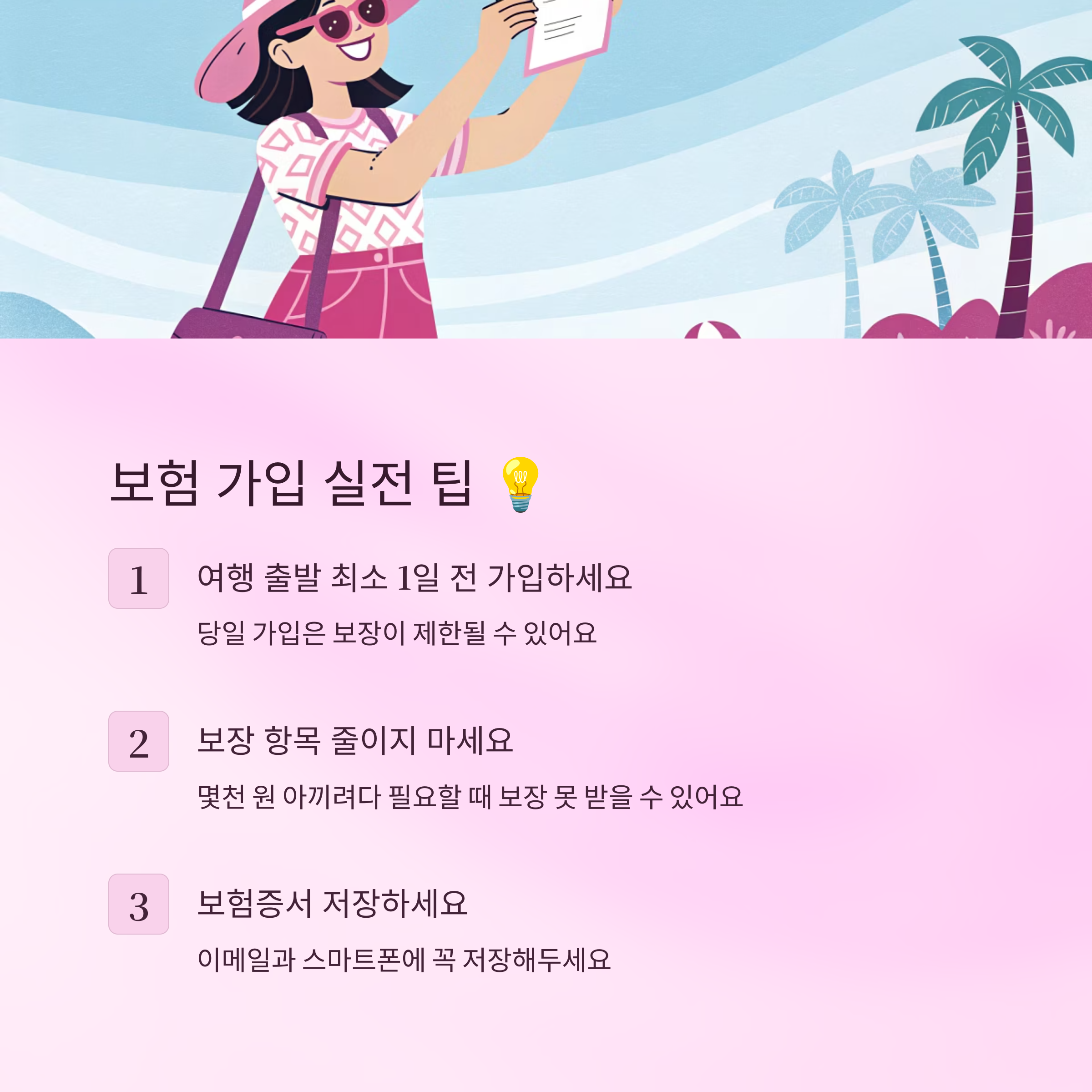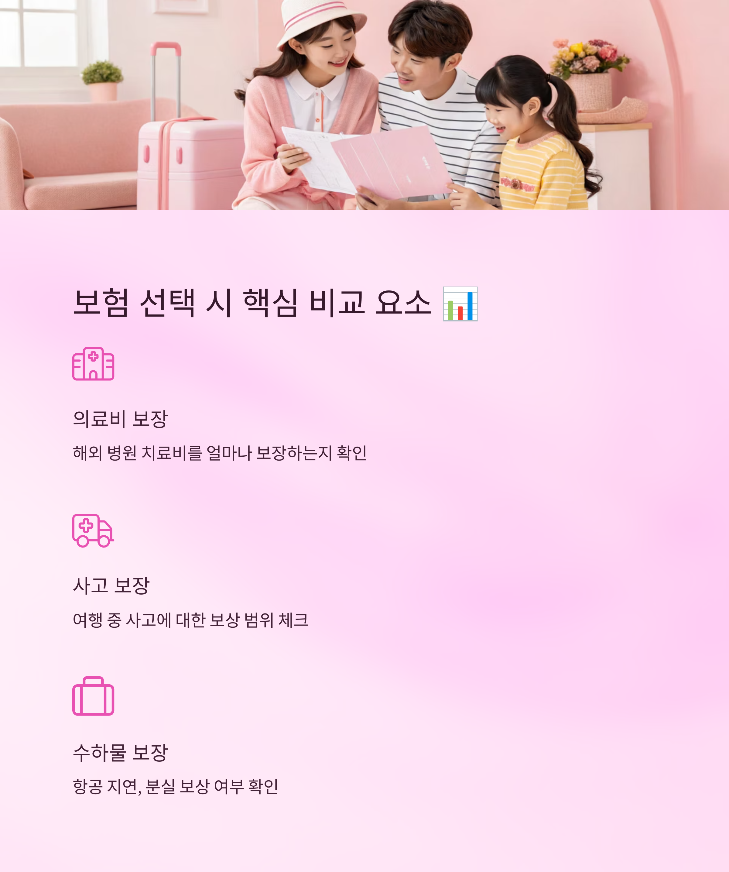 둘째, 보장 항목을 너무 줄이지 않는 것이 좋아요. 보험료 몇 천 원 아끼려고 최소 보장만 선택하면 정작 필요한 상황에서 도움이 되지 않아요. 특히 의료, 사고, 수하물 보상은 필수로 넣는 걸 추천해요.