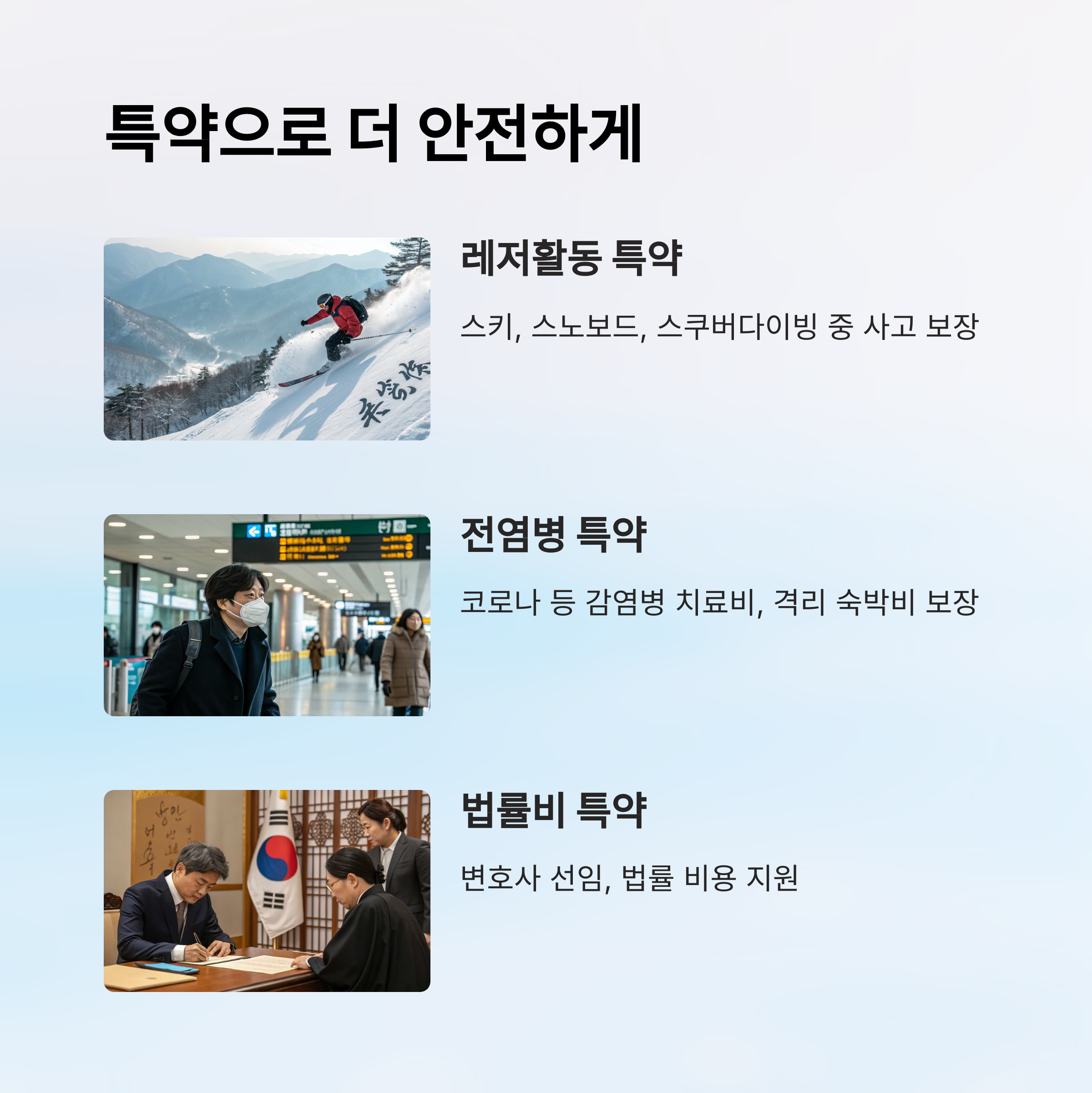 | 레저활동 특약 | 스포츠 중 사고 보장 | 스키, 스쿠버 여행자 | 약 2,000~5,000원 |