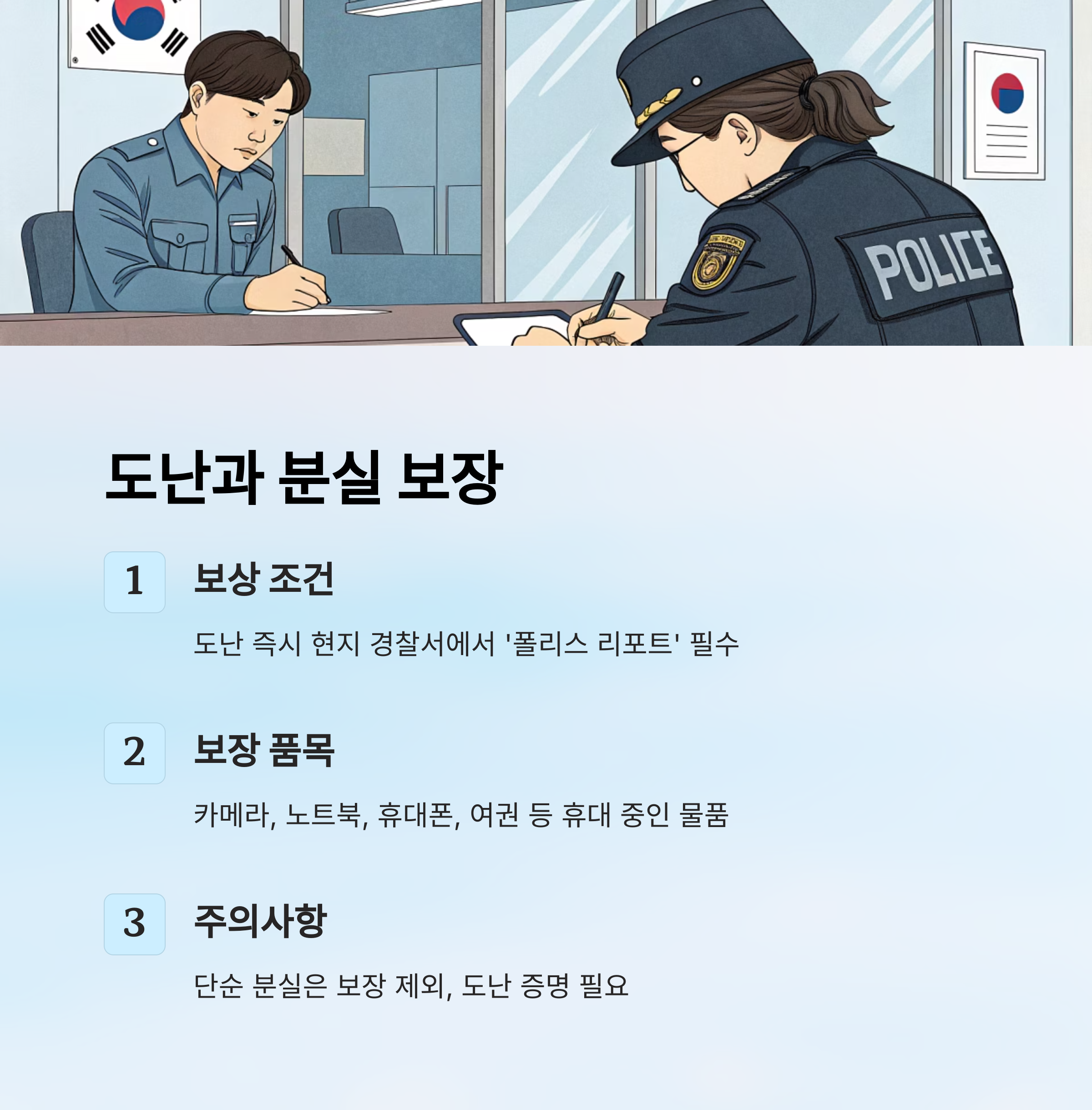 | 여권 | 도난 시 재발급 비용 보장 | 실비 보상 | 현지 신고 필수 |