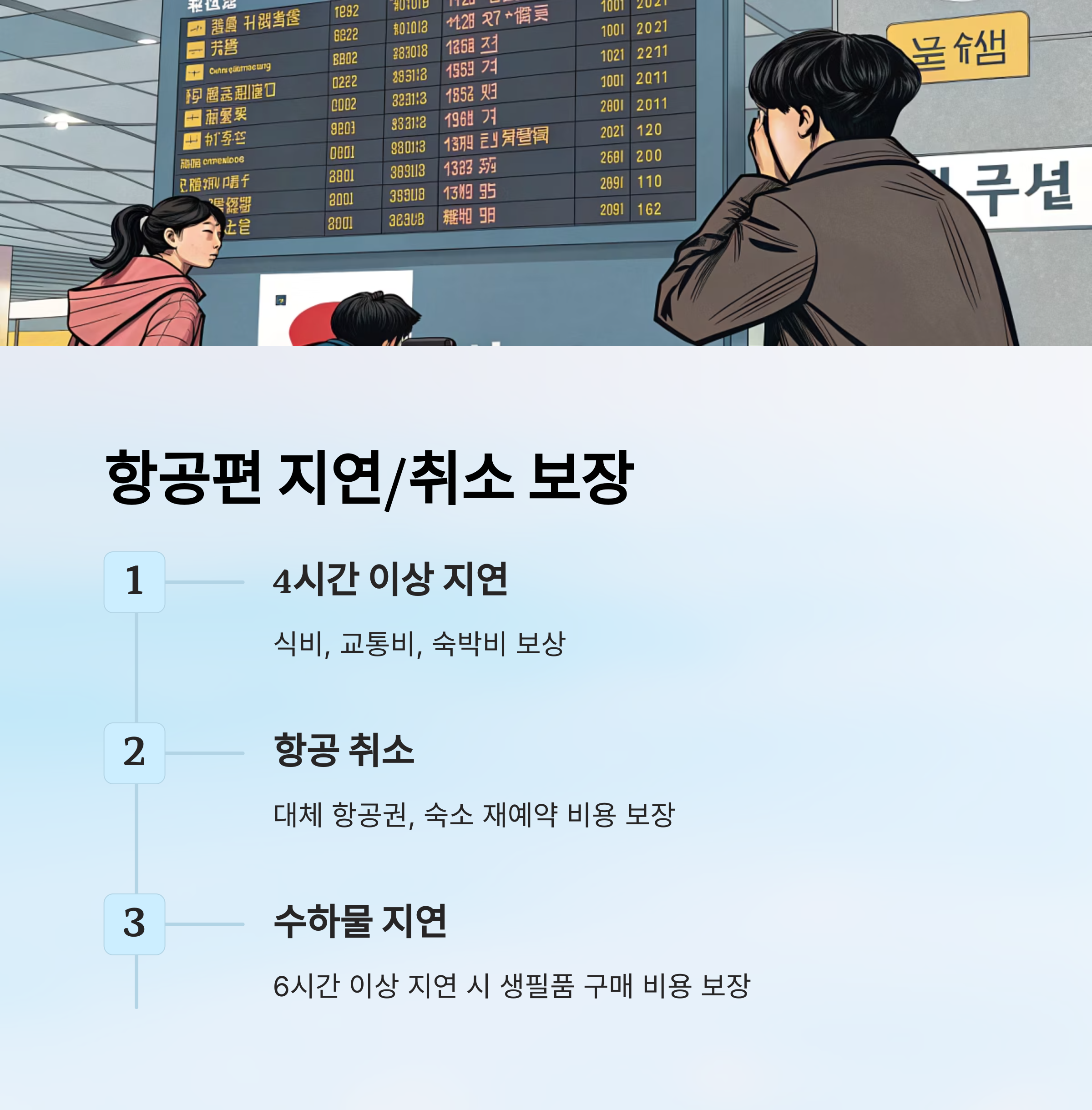 | 항공 지연 | 식비, 교통비, 숙박비 보상 | 4시간 이상 지연 | 항공사 확인서 |