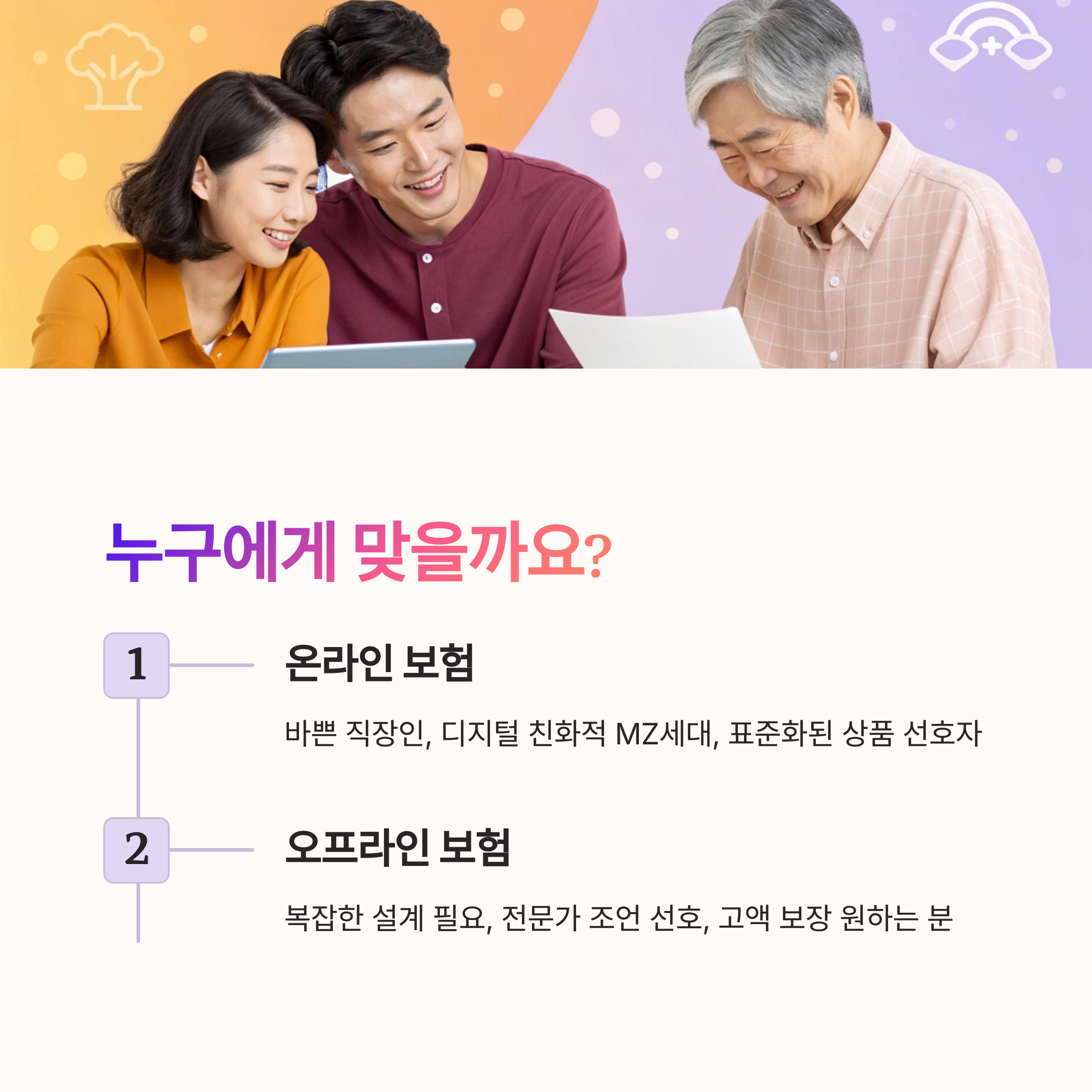 그는 보험료가 조금 비싸더라도 긴 시간 동안 신뢰할 수 있는 관리가 더 중요하다고 느꼈다고 해요. 이처럼 각각의 환경과 성향에 따라 온라인과 오프라인의 만족도가 달라지는 거죠.