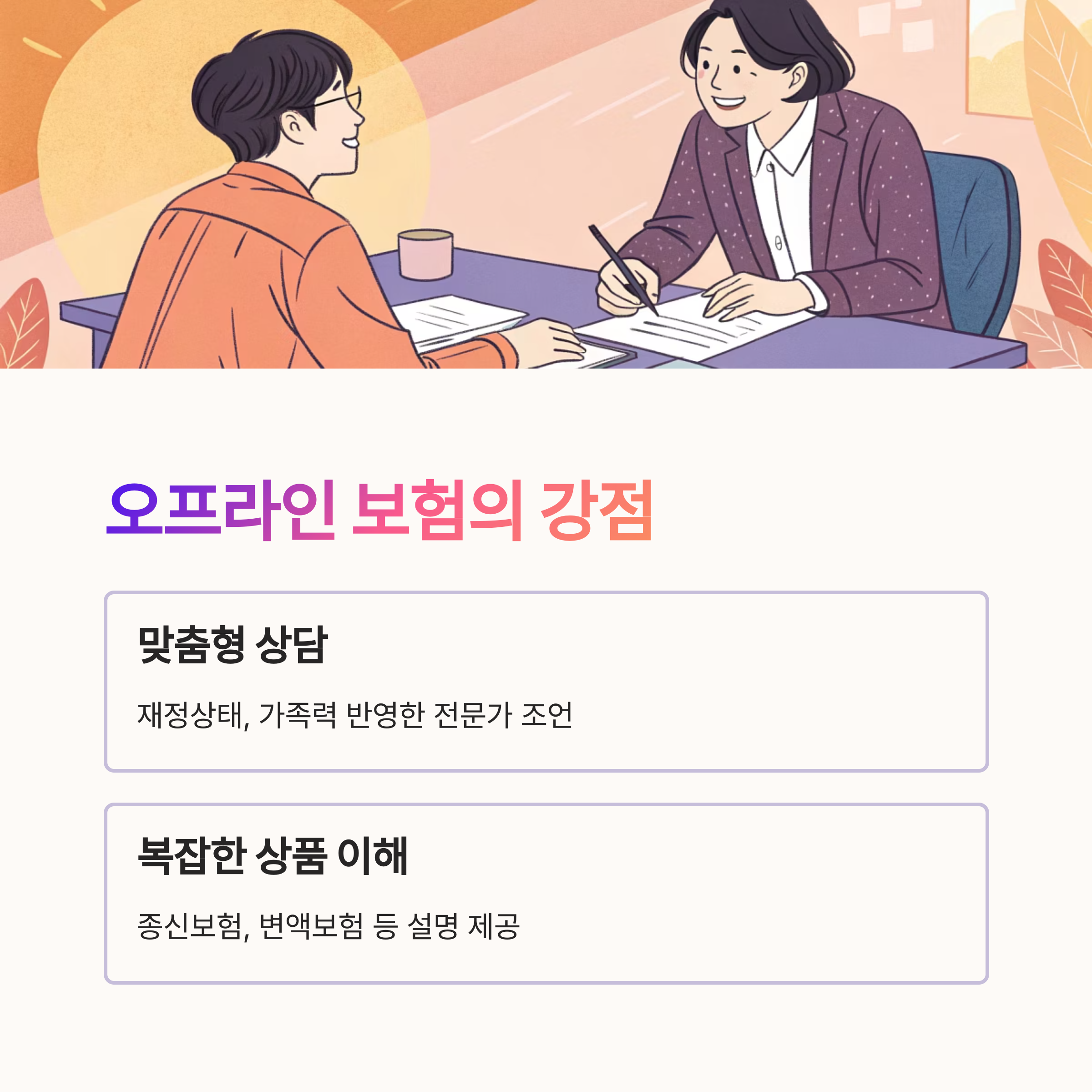🏢 오프라인 보험의 가장 큰 장점은 전문성과 상담이에요. 보험 설계사는 고객의 재정 상태, 가족력, 향후 계획까지 반영해 맞춤형 상품을 제안해줘요. 이런 정교한 접근은 온라인이 쉽게 대체할 수 없어요.