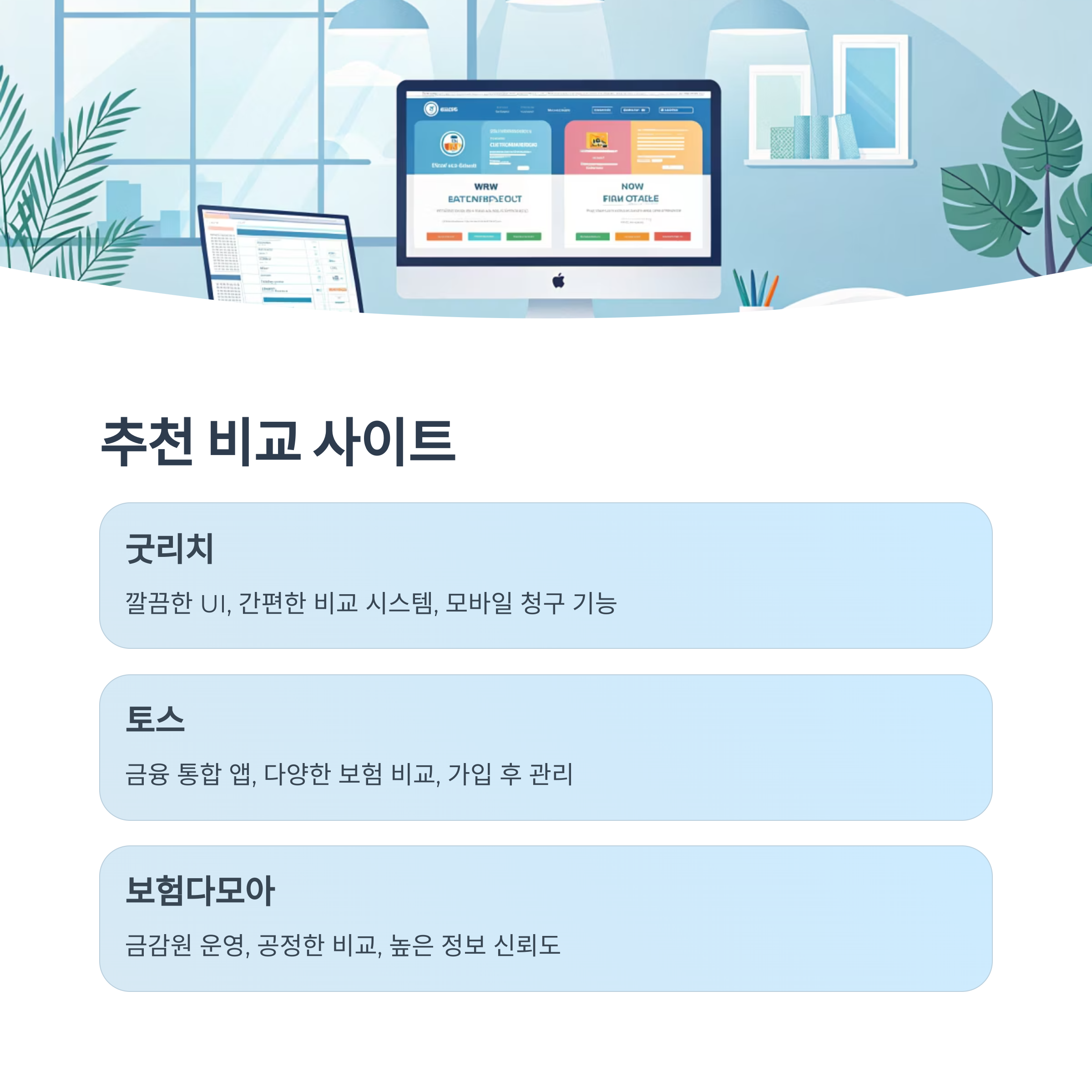 이 외에도 ‘마이리얼플랜’, ‘인슈로보’, ‘이지웰’ 등 다양한 비교 플랫폼이 있어요. 직접 몇 곳을 이용해보면서 나에게 가장 편한 UI와 정보 구성을 갖춘 곳을 선택하면 좋아요.
