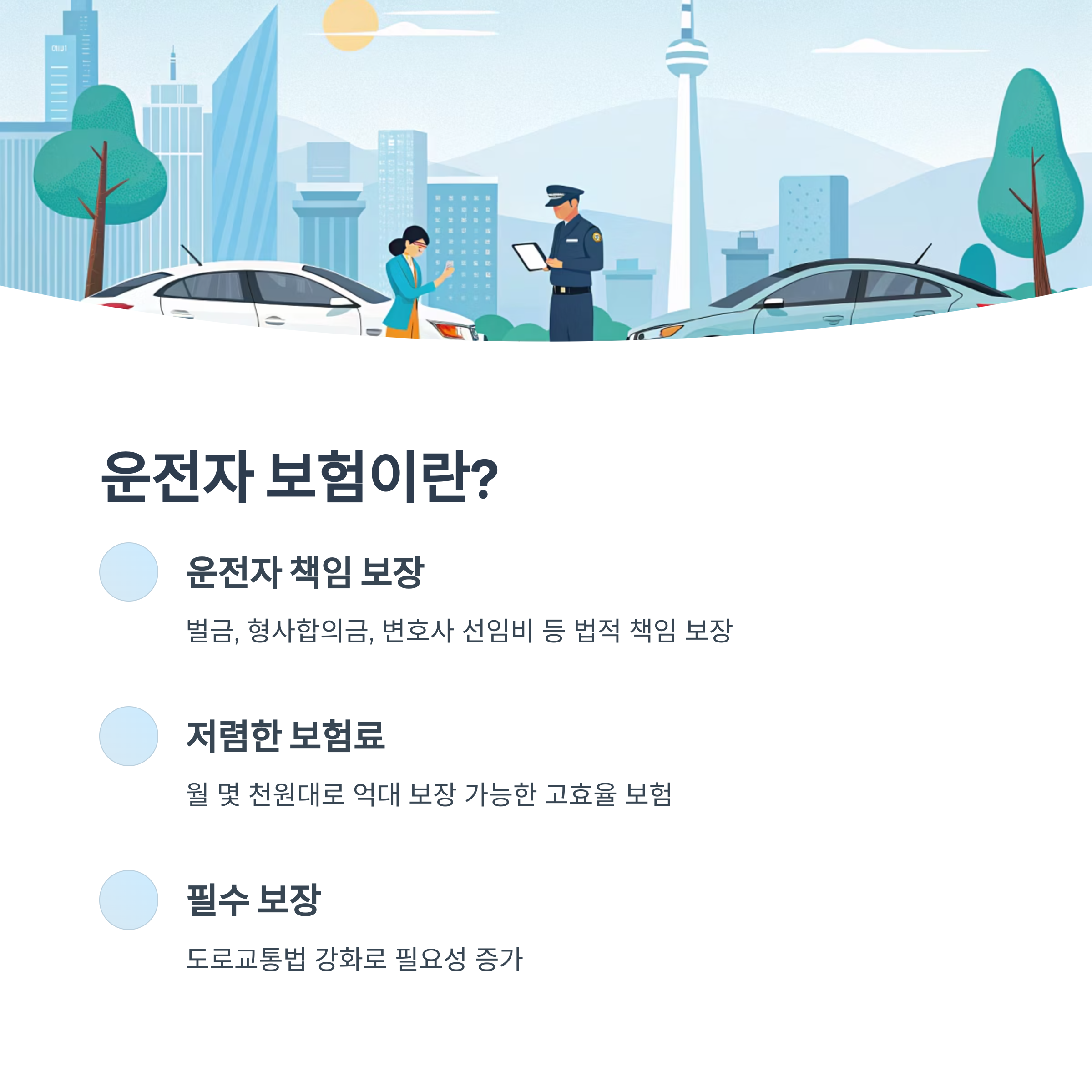 운전자 보험은 자동차 사고 발생 시 운전자의 법적 책임과 경제적 부담을 줄여주는 중요한 보장 수단이에요. 실제 사고가 발생했을 때 교통사고 처리 지원, 벌금 보장, 형사합의금 지원 등 다양한 도움을 받을 수 있어요. 특히 한국에서는 자동차 의무보험 외에 운전자 보험을 추가로 드는 경우가 많아요.