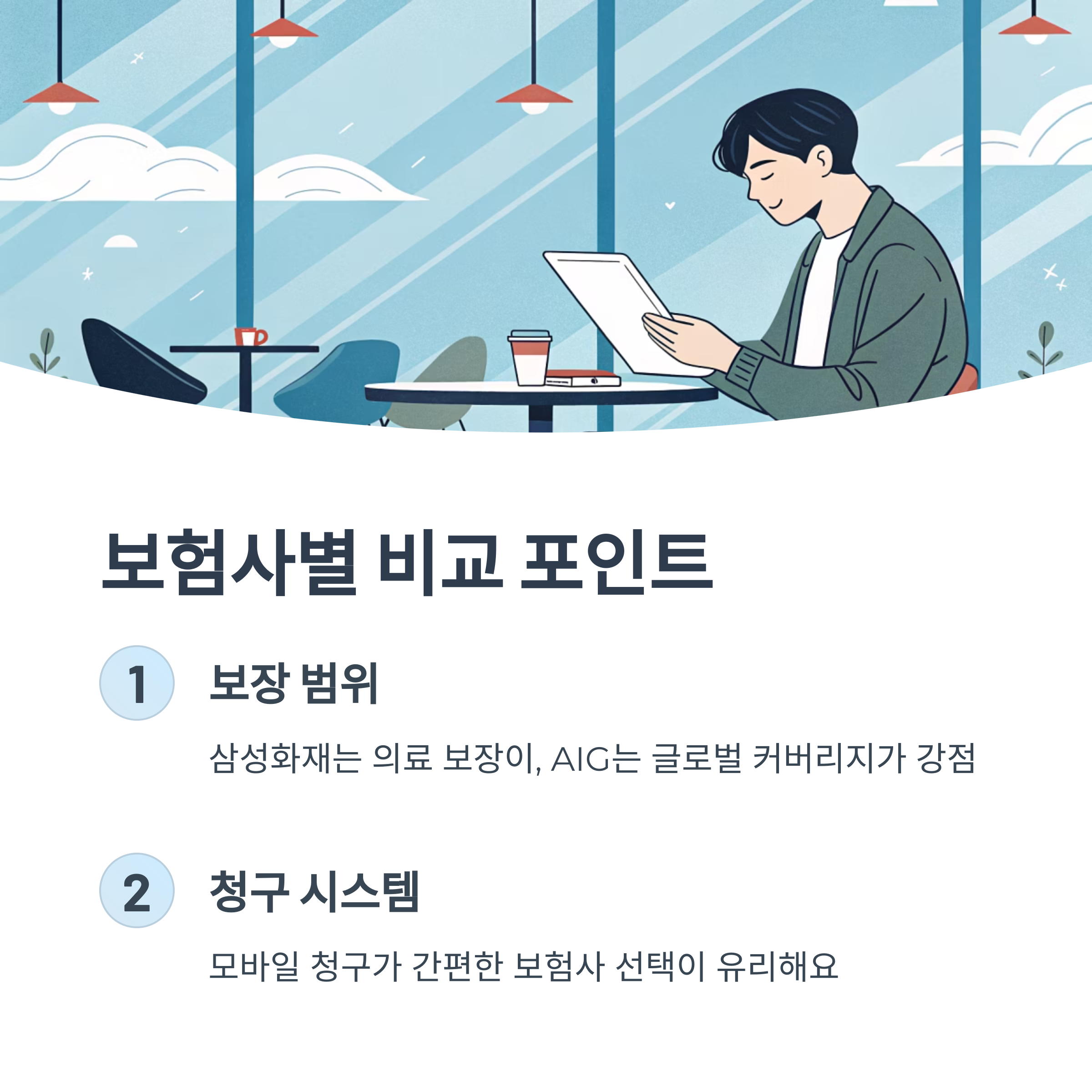 예를 들어 삼성화재는 해외 의료 보장이 탄탄하고, 긴급 이송 서비스가 빠르다는 장점이 있어요. 반면 AIG는 전 세계 대부분의 나라를 커버하고, 비대면 청구 시스템이 잘 되어 있어요. 편리함을 중시하는 사람에게 좋아요.