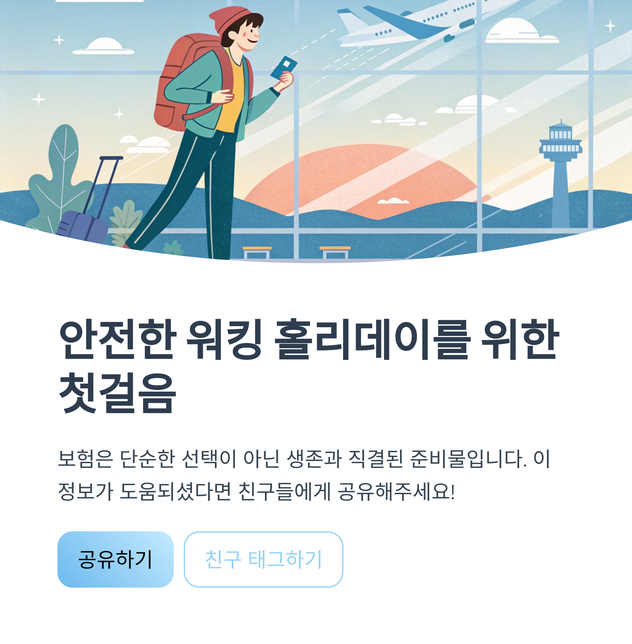 워킹 홀리데이 보험은 단순히 아플 때를 대비하는 게 아니라, 해외 생활 전반을 지켜주는 든든한 방패 같은 존재예요. 불확실한 타지 생활 속에서 나를 지킬 수 있는 가장 기본적인 무기죠!