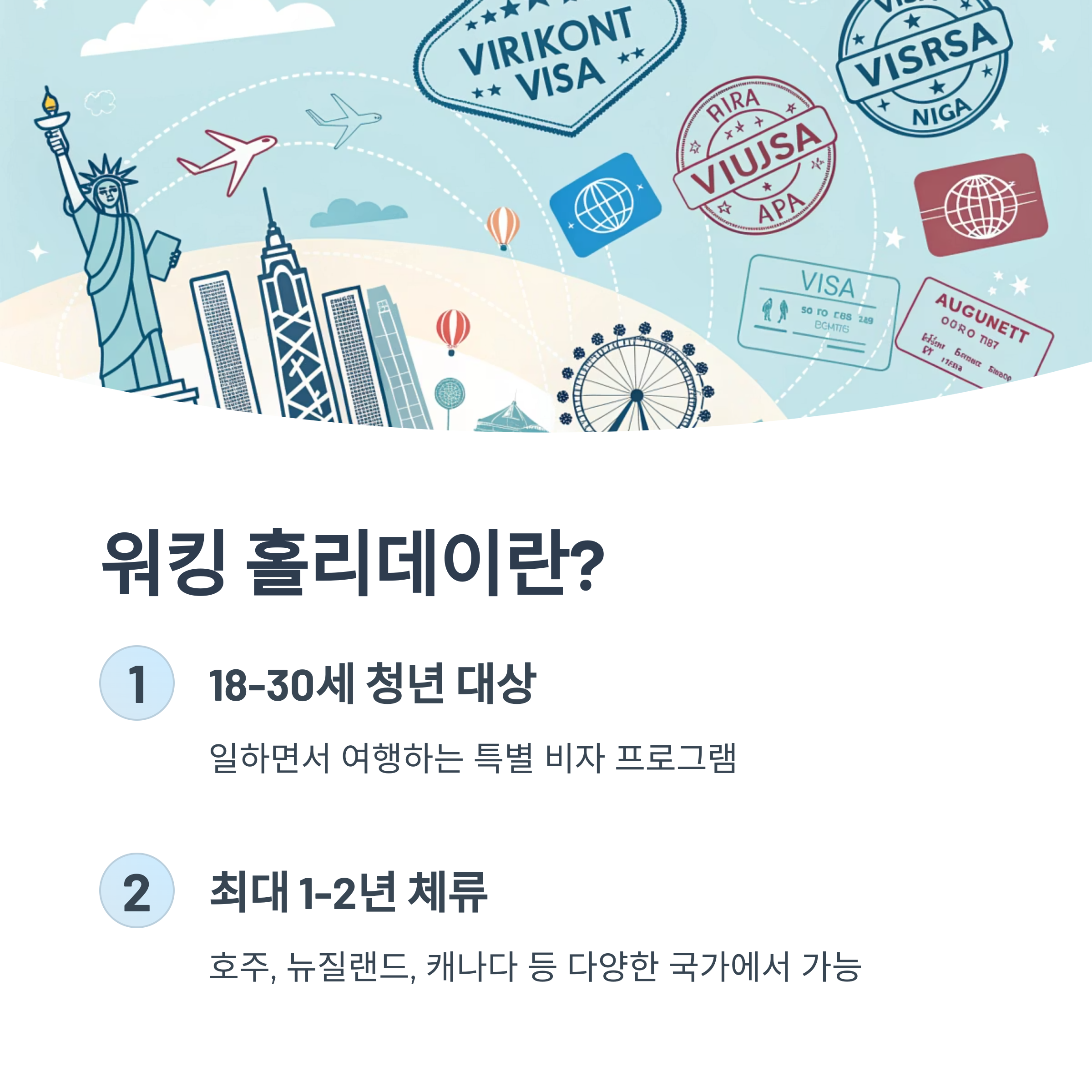 워킹 홀리데이(Working Holiday)는 일하면서 여행을 즐길 수 있는 청년 대상 체류 비자 제도예요. 만 18세에서 30세 사이의 청년들이 1년 또는 최대 2년까지 해당 국가에 머무르며 일자리도 경험하고 여행도 할 수 있는 기회를 주는 특별한 프로그램이죠.
