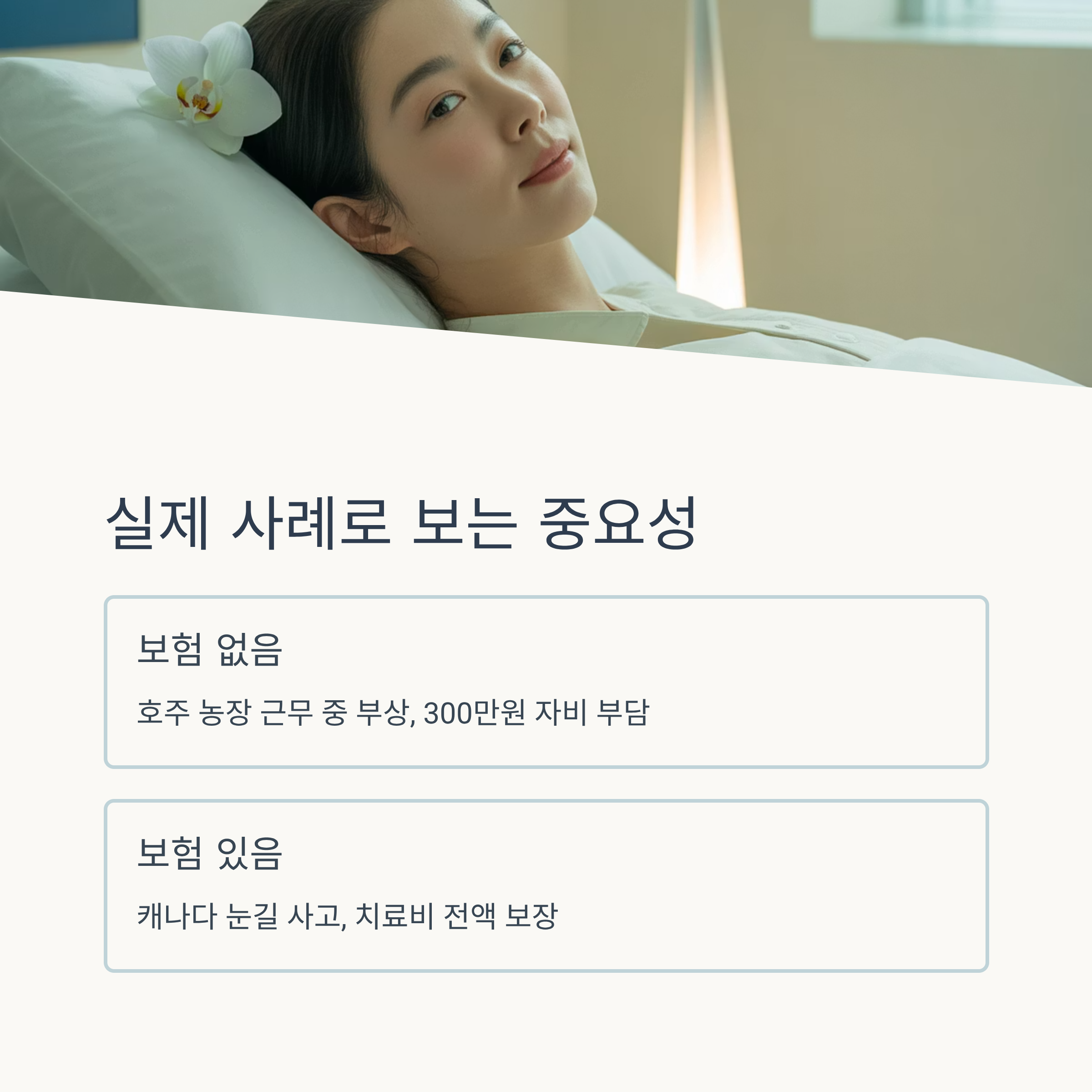 반면, 제대로 보험에 가입해 큰 도움을 받은 사례도 있어요. 캐나다에서 일하던 D군은 눈길에 미끄러져 다리를 다쳤는데, 보험 덕분에 병원 진료비와 물리치료비, 약값까지 전액 보장받았어요. 게다가 치료 기간 동안 입원비까지 처리돼 추가 지출 없이 회복할 수 있었죠.