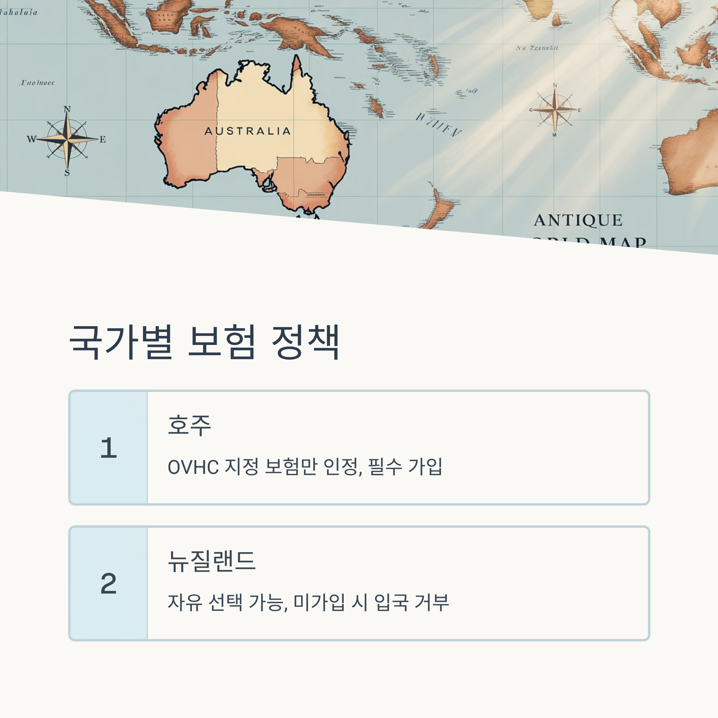 호주에서는 입국 전에 반드시 'Overseas Visitors Health Cover(OVHC)'에 가입해야 해요. 이건 정부가 요구하는 지정 보험으로, 민간 보험사에서만 판매되고 있어요. 보장이 꽤 폭넓지만 가격도 높은 편이에요. 반면 뉴질랜드는 자유롭게 선택 가능하지만, 반드시 여행자 보험 형태의 의료보장이 포함되어야 입국이 허용돼요.