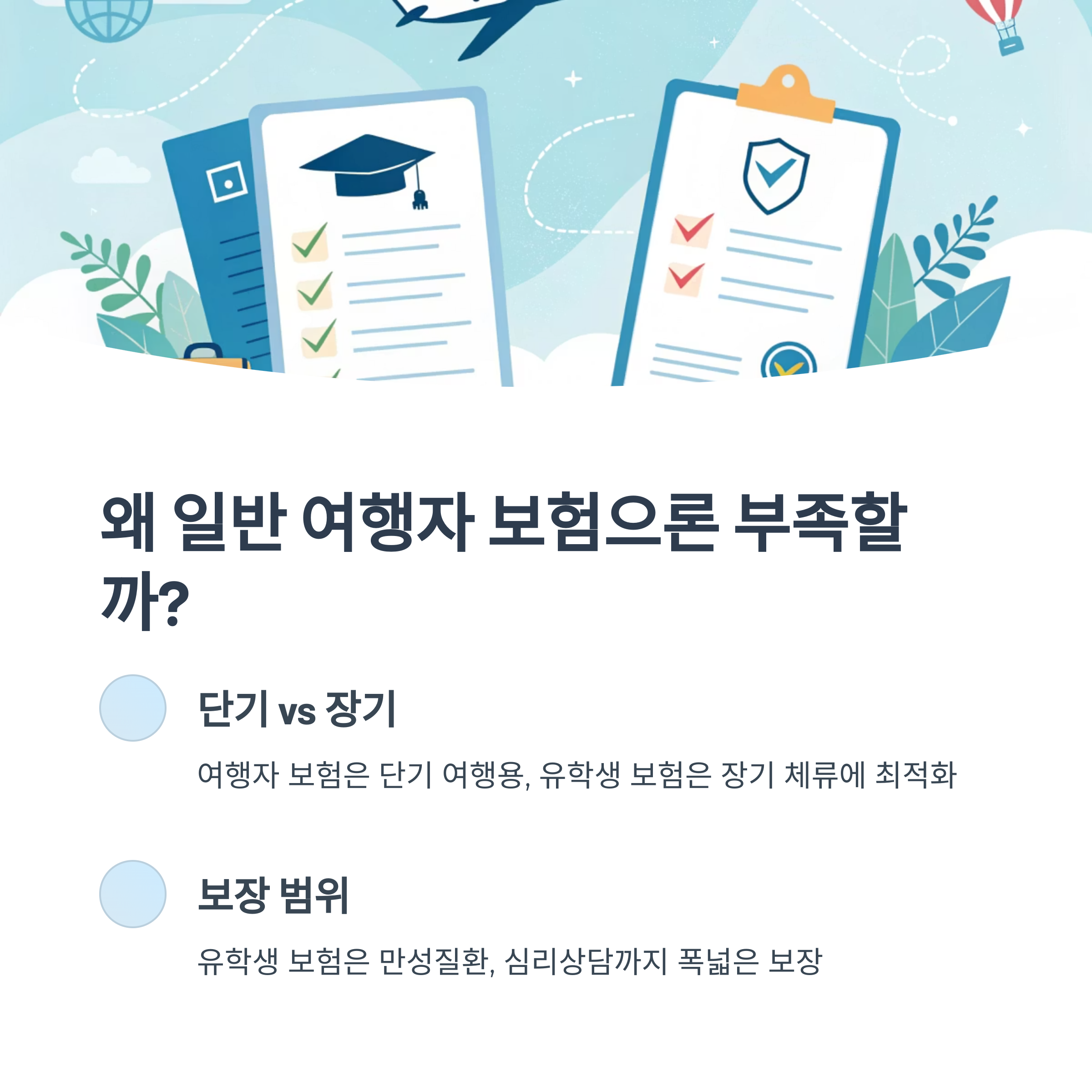 쉽게 말해, 여행자 보험은 단거리 여행용 캐리어라면, 유학생 보험은 장기 여행을 위한 큰 트렁크 같은 거예요. 유학이라는 상황에 맞게 설계된 보험을 선택하는 게 훨씬 더 현명하답니다.