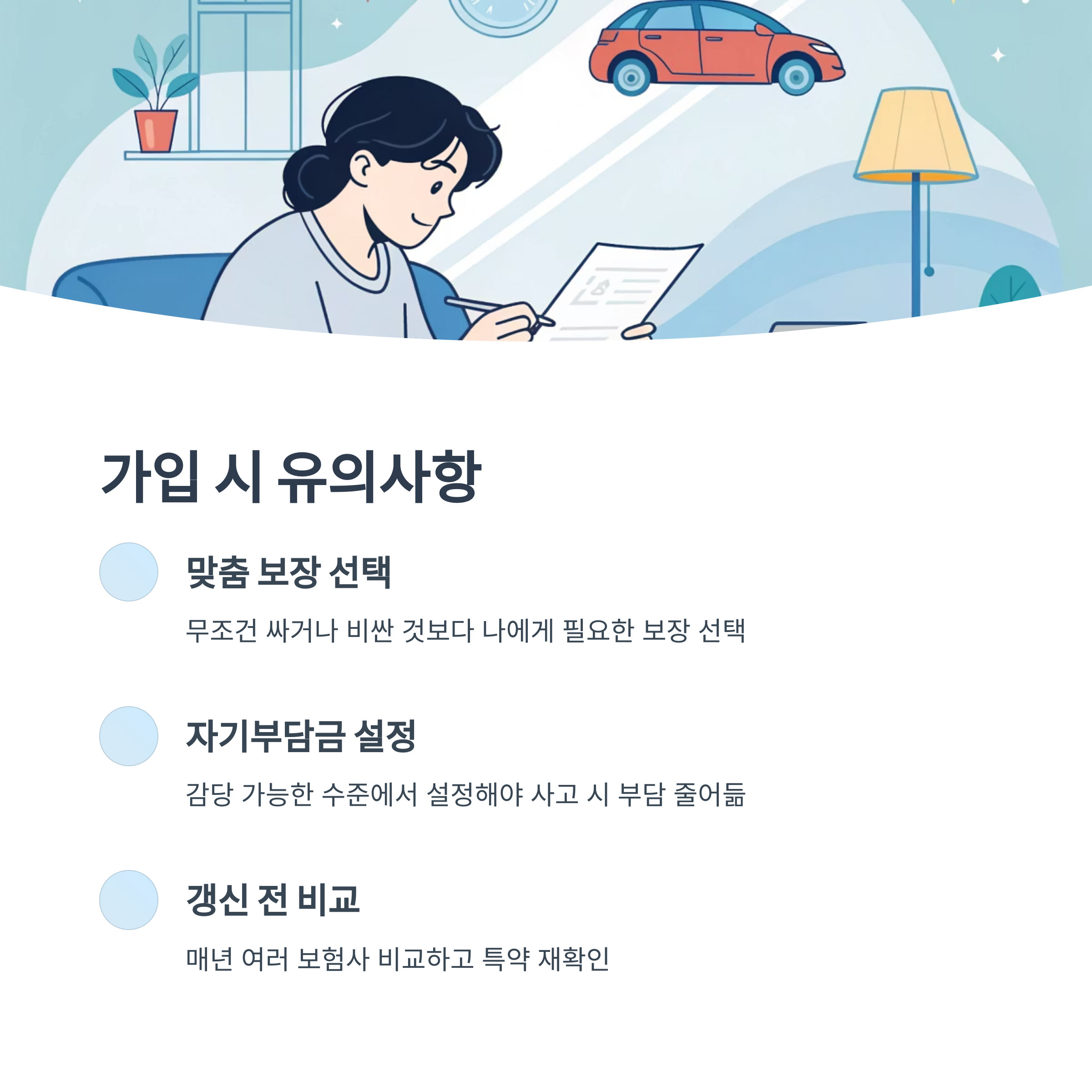 자동차 보험 가입할 때 가장 중요한 건 ‘나에게 맞는 보장’을 선택하는 거예요. 무조건 싸다고 좋은 게 아니고, 비싸다고 다 보장해주는 것도 아니니까요.