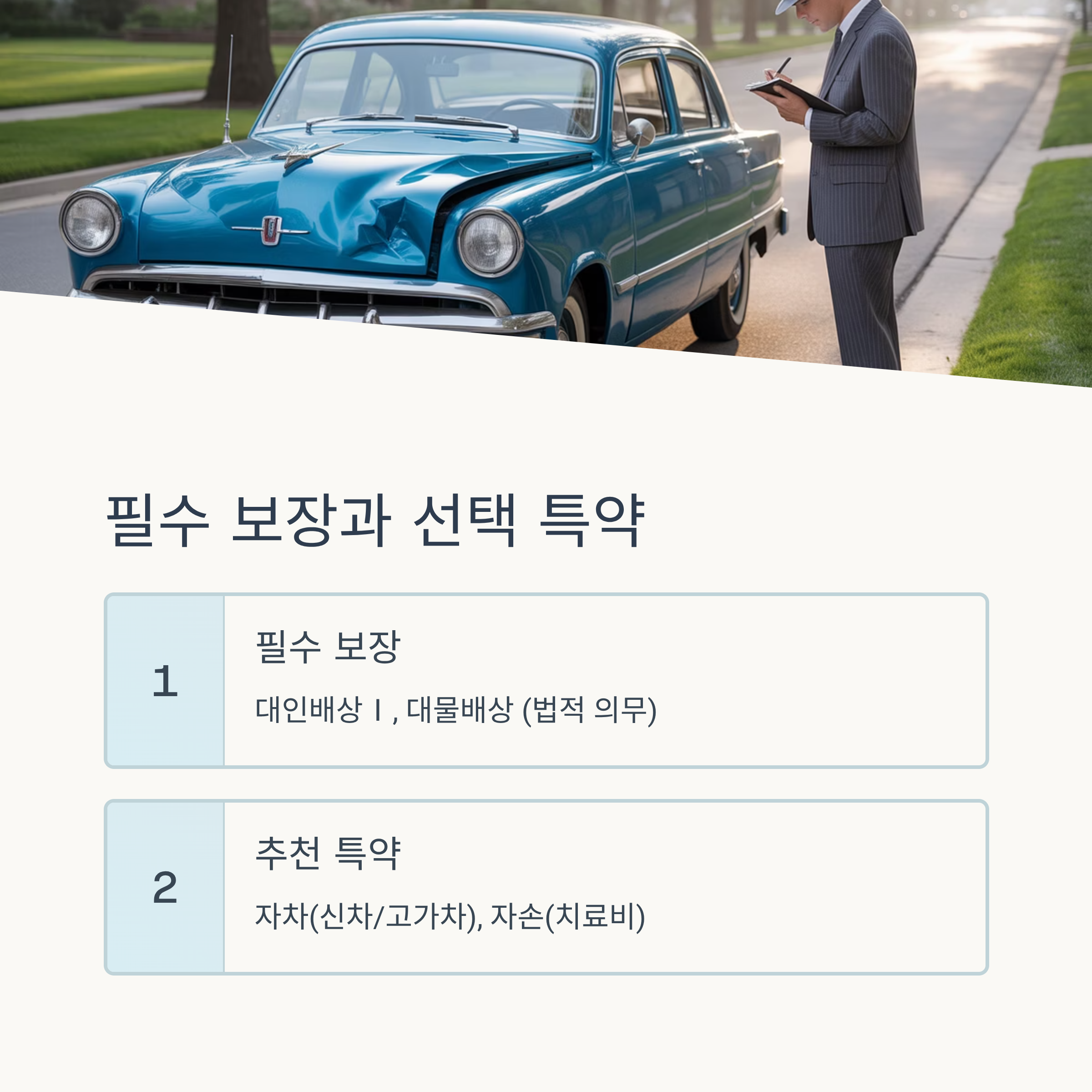 하지만 여기에 추가적으로 가입할 수 있는 ‘선택 특약’들이 있어요. 바로 이 특약들이 보험료 차이를 만들고, 실제 사고 상황에서도 도움을 줄 수 있는 핵심이에요. 대표적으로 자차(자기차량손해), 자손(자기신체손해), 무보험차상해, 긴급출동 서비스 등이 있죠.