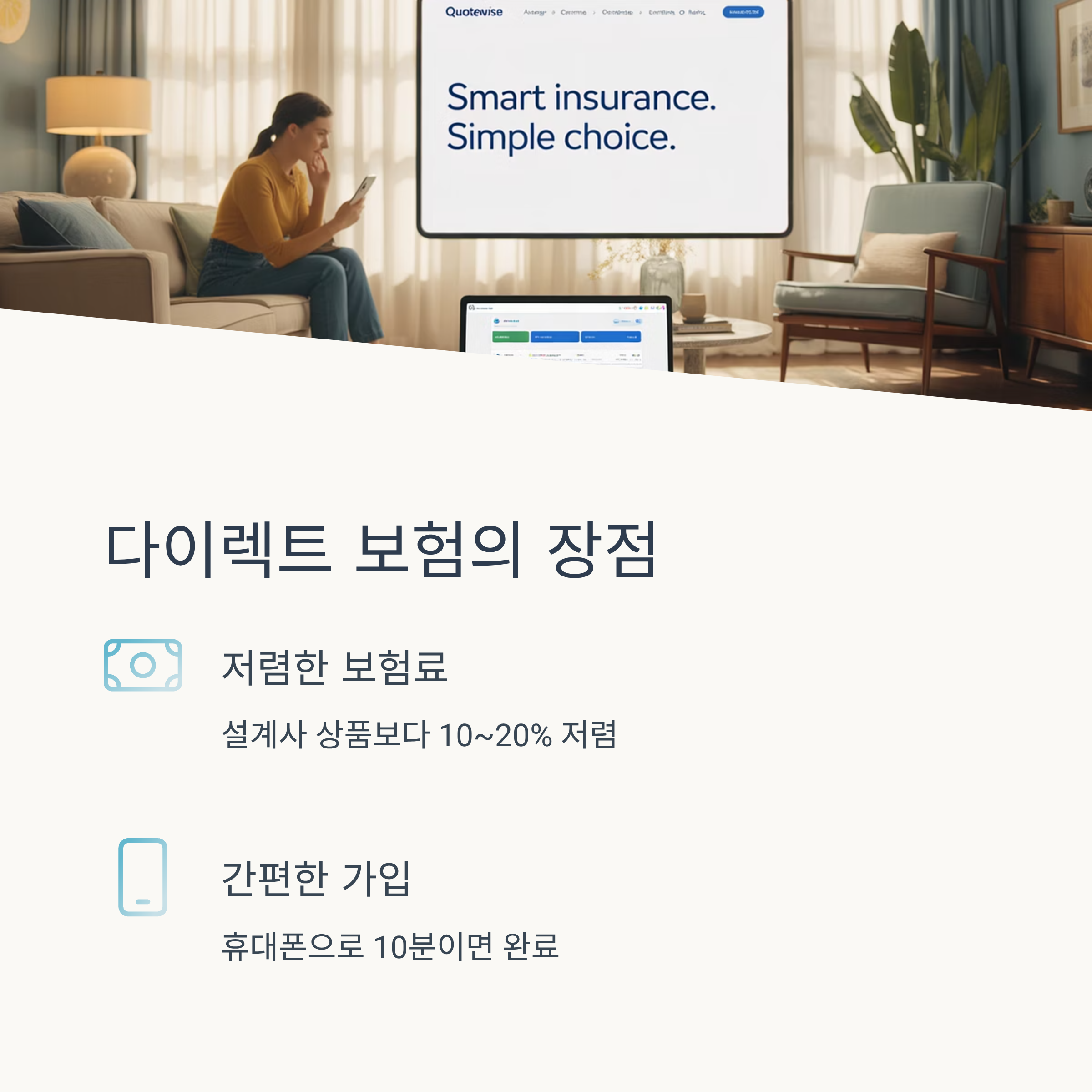 두 번째는 ‘가입 절차의 간편함’이에요. 예전에는 설계사와 만나서 상담하고 서류 작성하고 했어야 했지만, 이제는 휴대폰만 있으면 10분이면 가입 완료! 정말 간편해요.