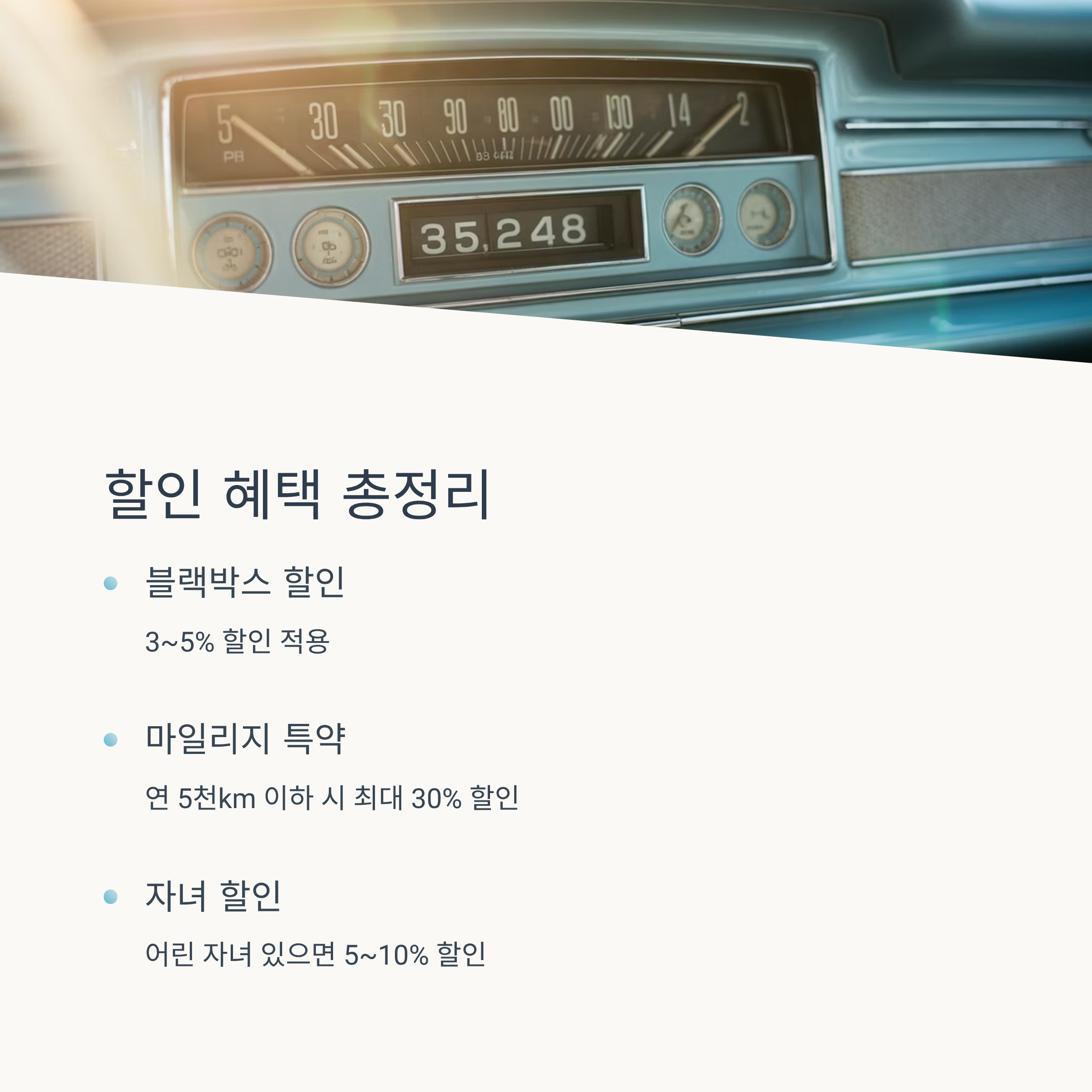 마지막으로는 ‘다양한 할인 혜택’이 있다는 점도 빼놓을 수 없어요. 블랙박스 장착, 마일리지 운전, 자녀 할인 등 다양한 조건에 해당된다면 보험료를 더 절약할 수 있어요.