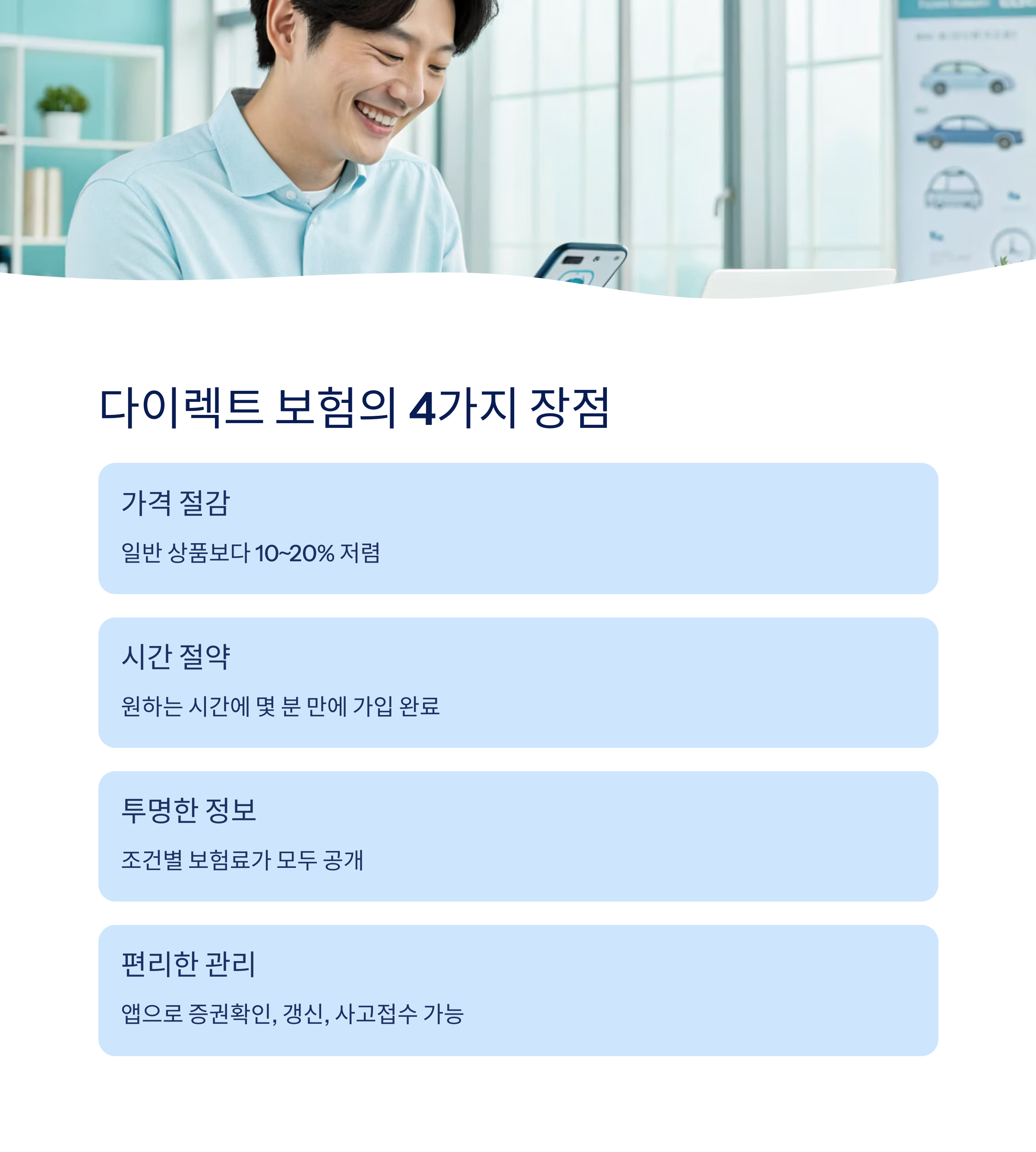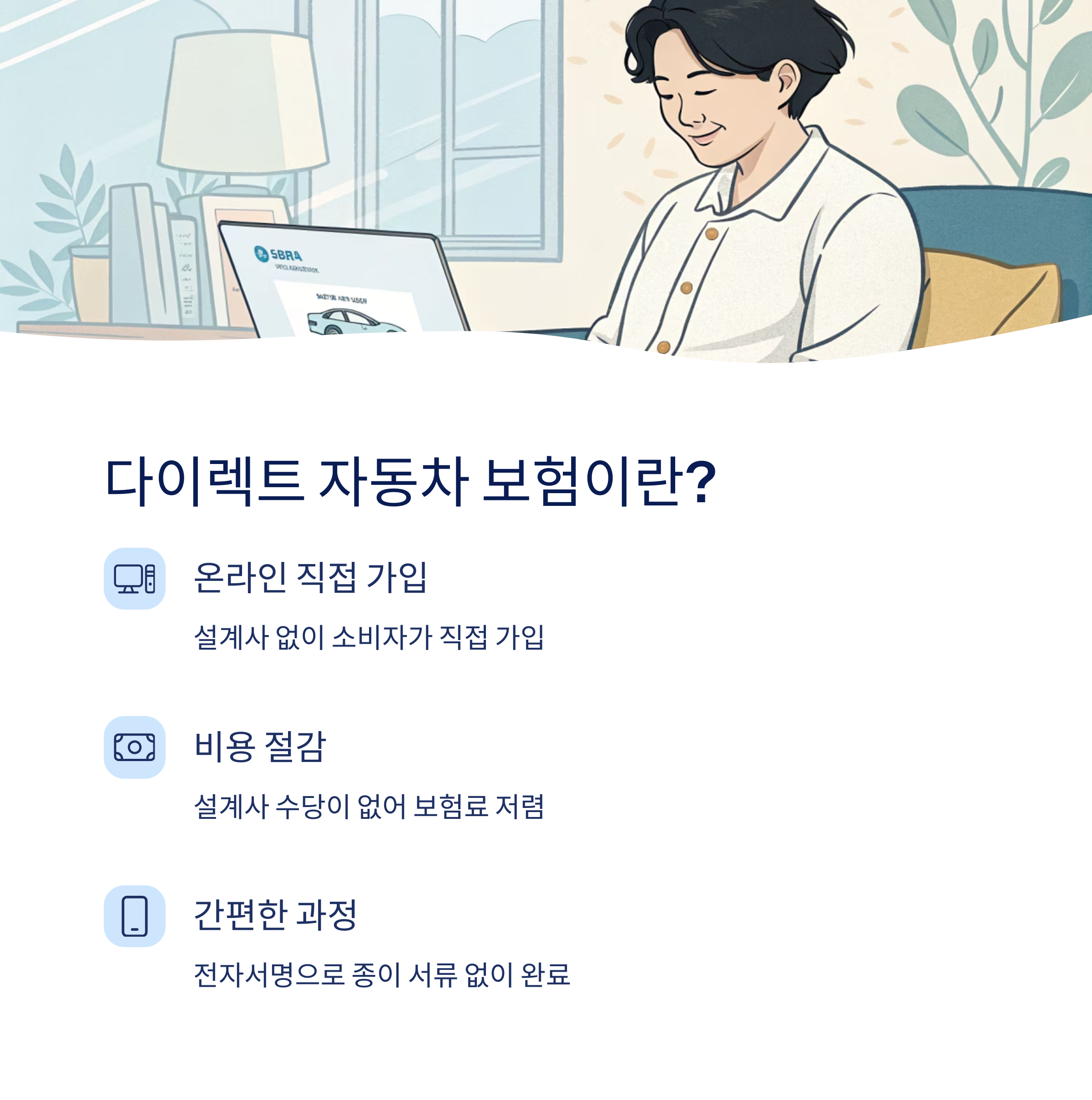 자동차 보험, 이제는 발품보다 손품이 중요해졌어요! 클릭 몇 번으로 보험을 직접 비교하고 가입할 수 있는 ‘다이렉트 자동차 보험’은 복잡한 절차 없이 간편하게 내게 꼭 맞는 조건을 찾을 수 있어서 많은 사람들이 선호하고 있어요.