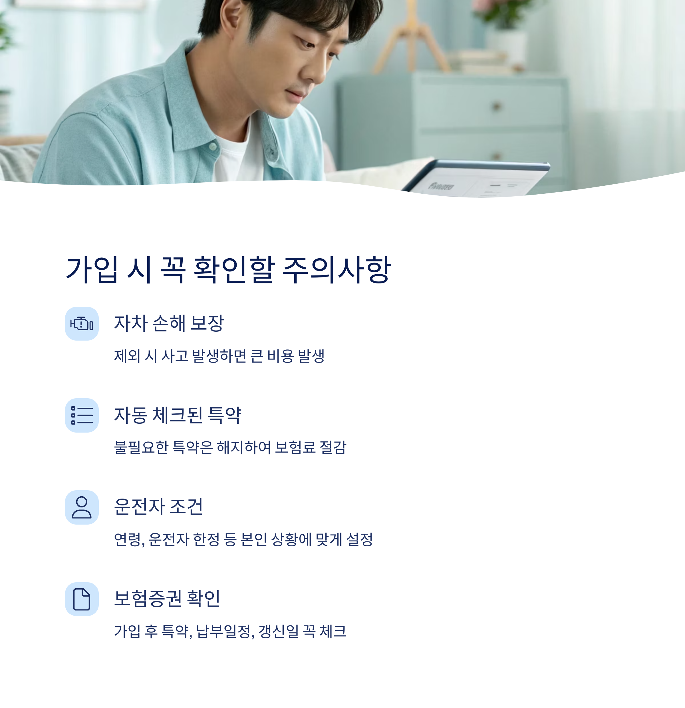만 26세 이상, 운전자 한정, 가족 한정 등의 조건은 가입자 본인의 운전 습관과 맞는 조건인지 꼭 검토해야 해요. 그렇지 않으면 사고 시 보장을 못 받을 수도 있어요.
