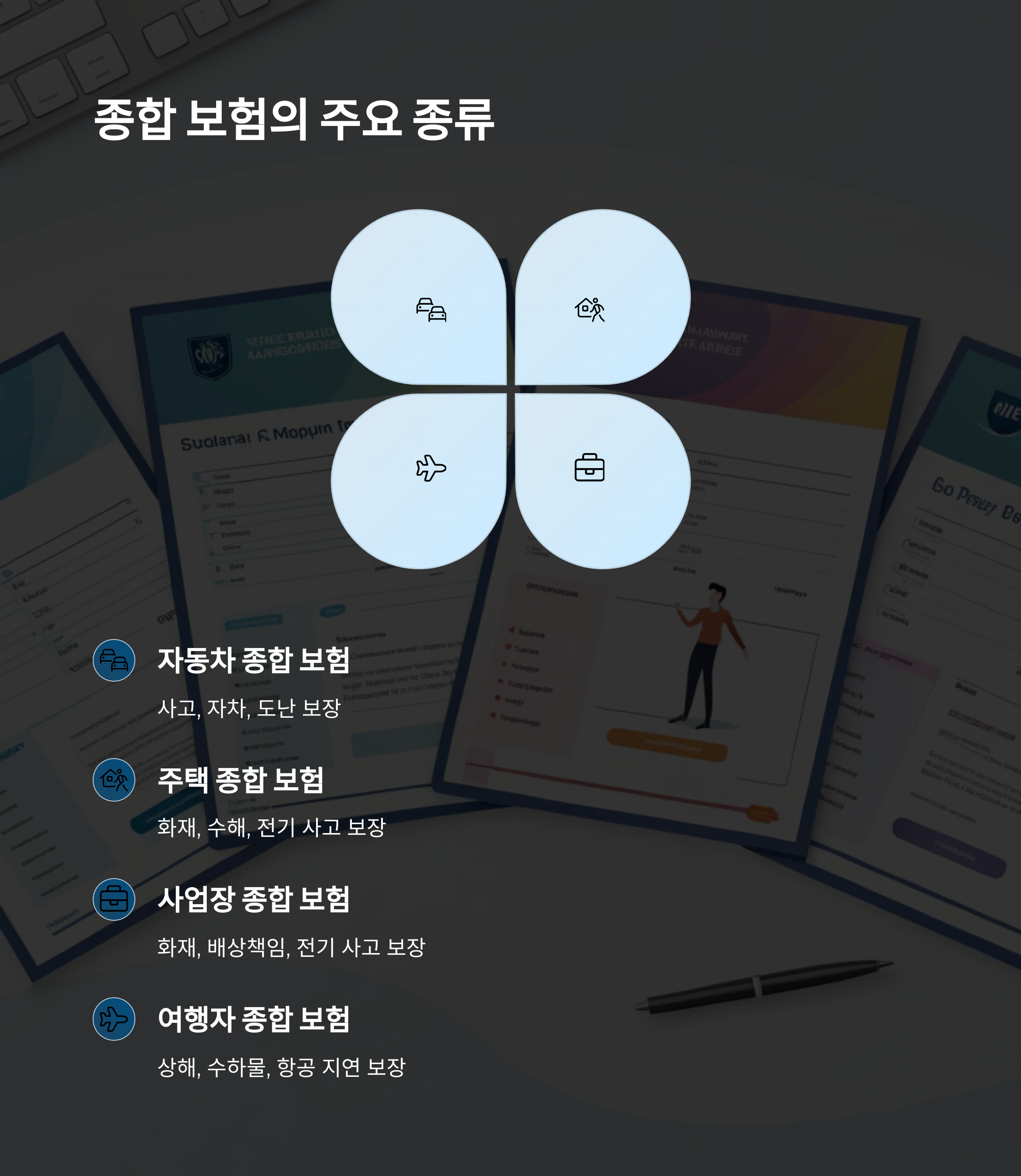 대표적인 종류로는 자동차 종합 보험, 주택 종합 보험, 개인 상해 종합 보험, 사업장 종합 보험, 여행자 종합 보험 등이 있어요. 이름은 다르지만, 공통점은 여러 위험을 하나의 패키지로 커버한다는 점이에요.