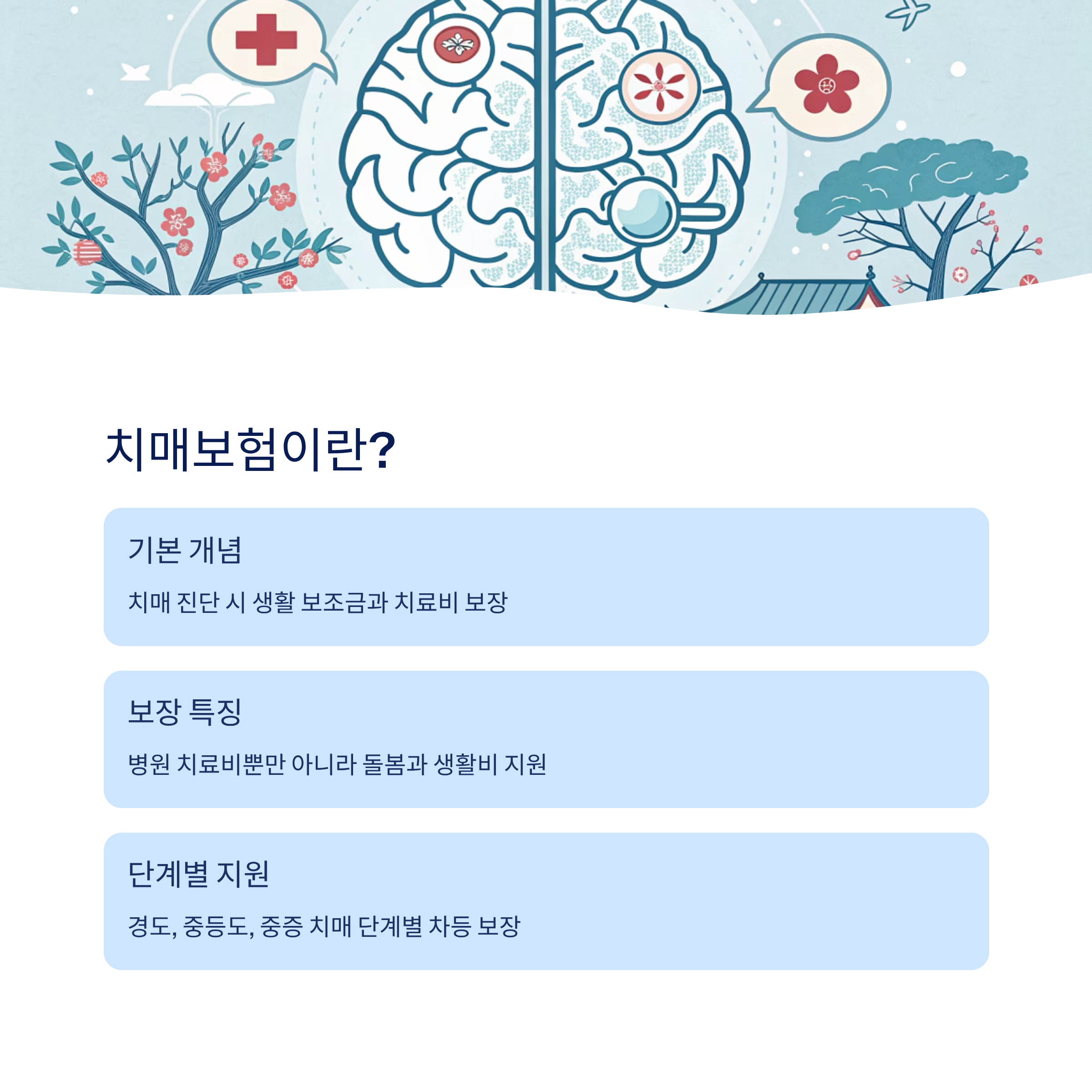 이처럼 치매보험의 기본 개념은 단순하지만, 실제로 상품을 고르려고 하면 선택지가 많아서 헷갈릴 수 있어요. 그래서 다음 장에서는 구체적으로 어떤 보장을 받을 수 있는지, 치매보험이 제공하는 보장 범위에 대해 하나씩 살펴볼게요. 🤗