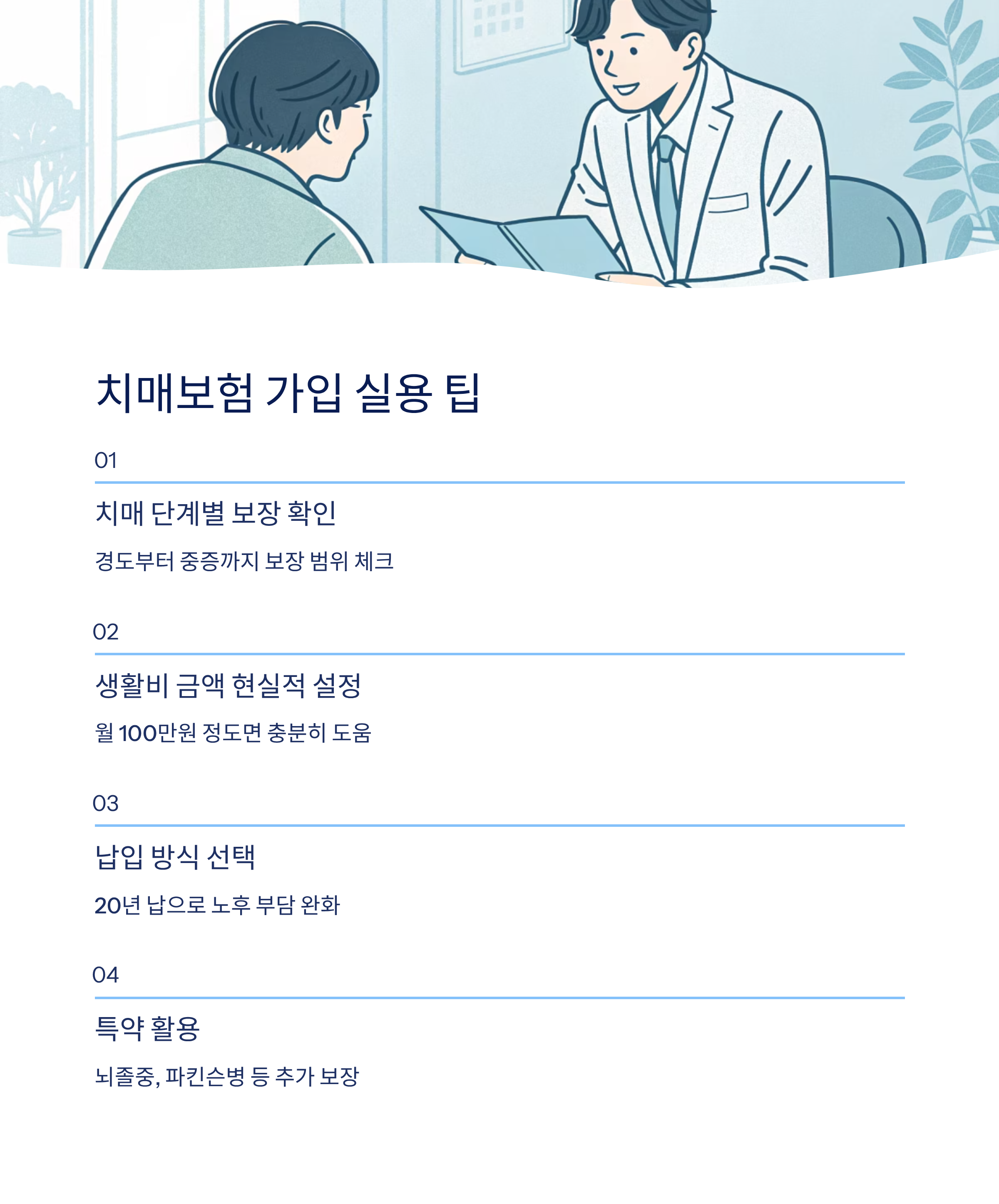 치매보험에 가입할 때는 단순히 보험료와 보장금액만 보지 말고 생활 전반에 도움이 되는 실질적인 조건을 따져야 해요. 보험은 장기간 유지하는 상품이기 때문에 처음부터 꼼꼼하게 비교하고 가입해야 후회가 없어요. 특히 치매보험은 보장 조건이 다양하기 때문에 몇 가지 실용적인 팁을 알고 있으면 훨씬 유리하게 가입할 수 있어요.