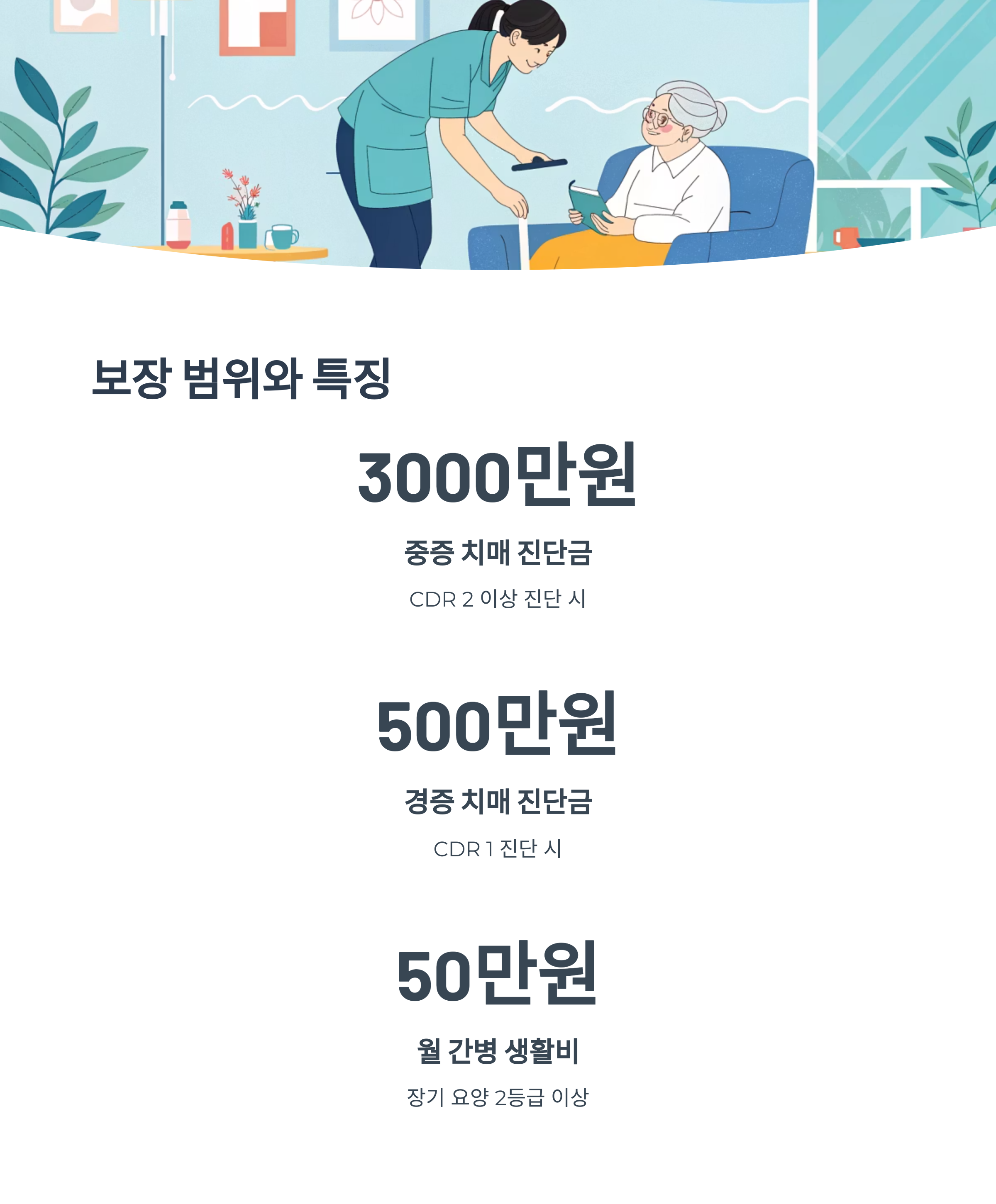 | 중증 치매 진단금 | CDR 2 이상 진단 시 | 최대 3000만 원 |