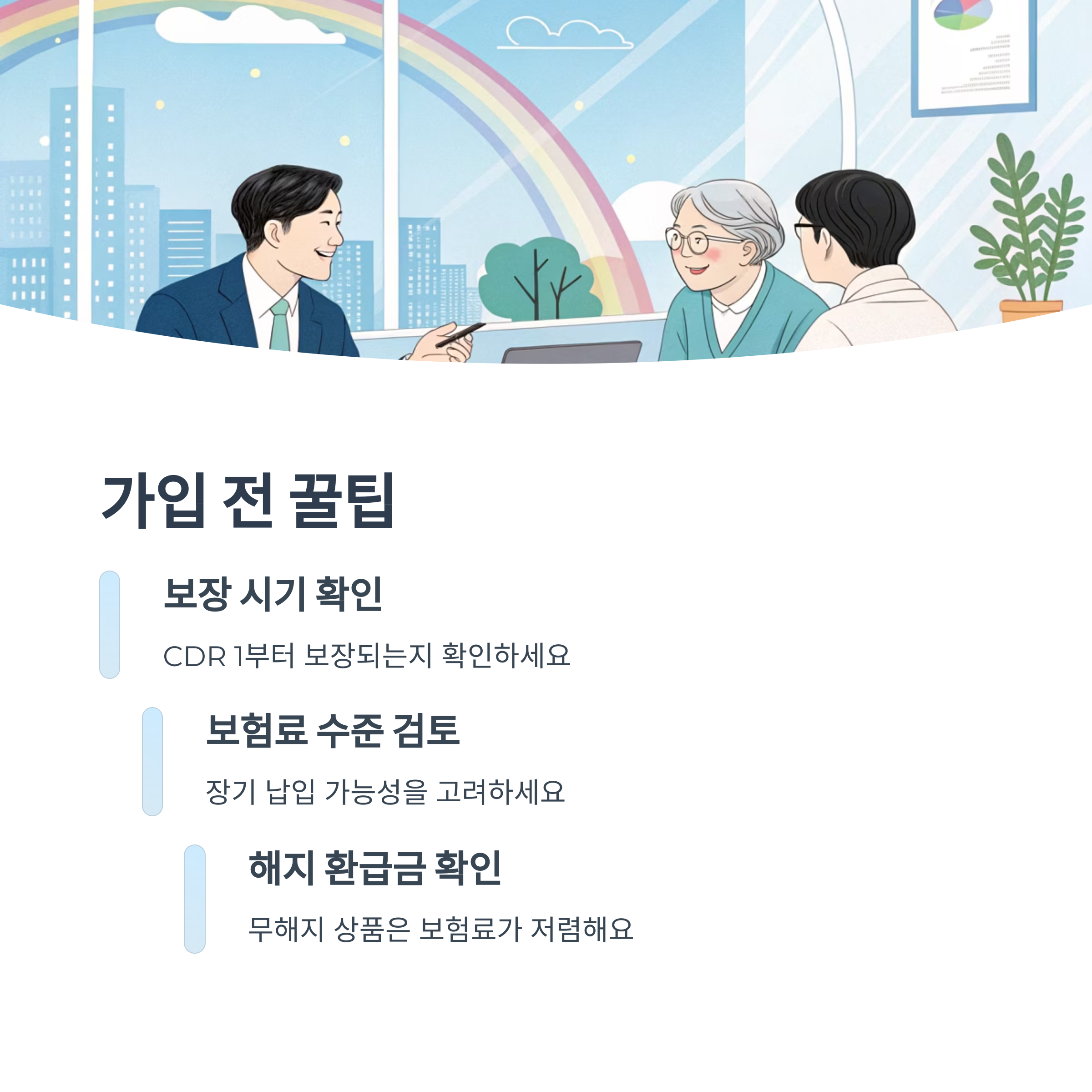 보험료 부담도 무시할 수 없죠. 고령일수록 보험료가 월 10만 원 이상이 될 수 있기 때문에, ‘해지환급금이 없는 저가형 상품’도 눈여겨볼 필요가 있어요. 요즘은 ‘무해지 환급형 치매 보험’이 인기랍니다. 😎
