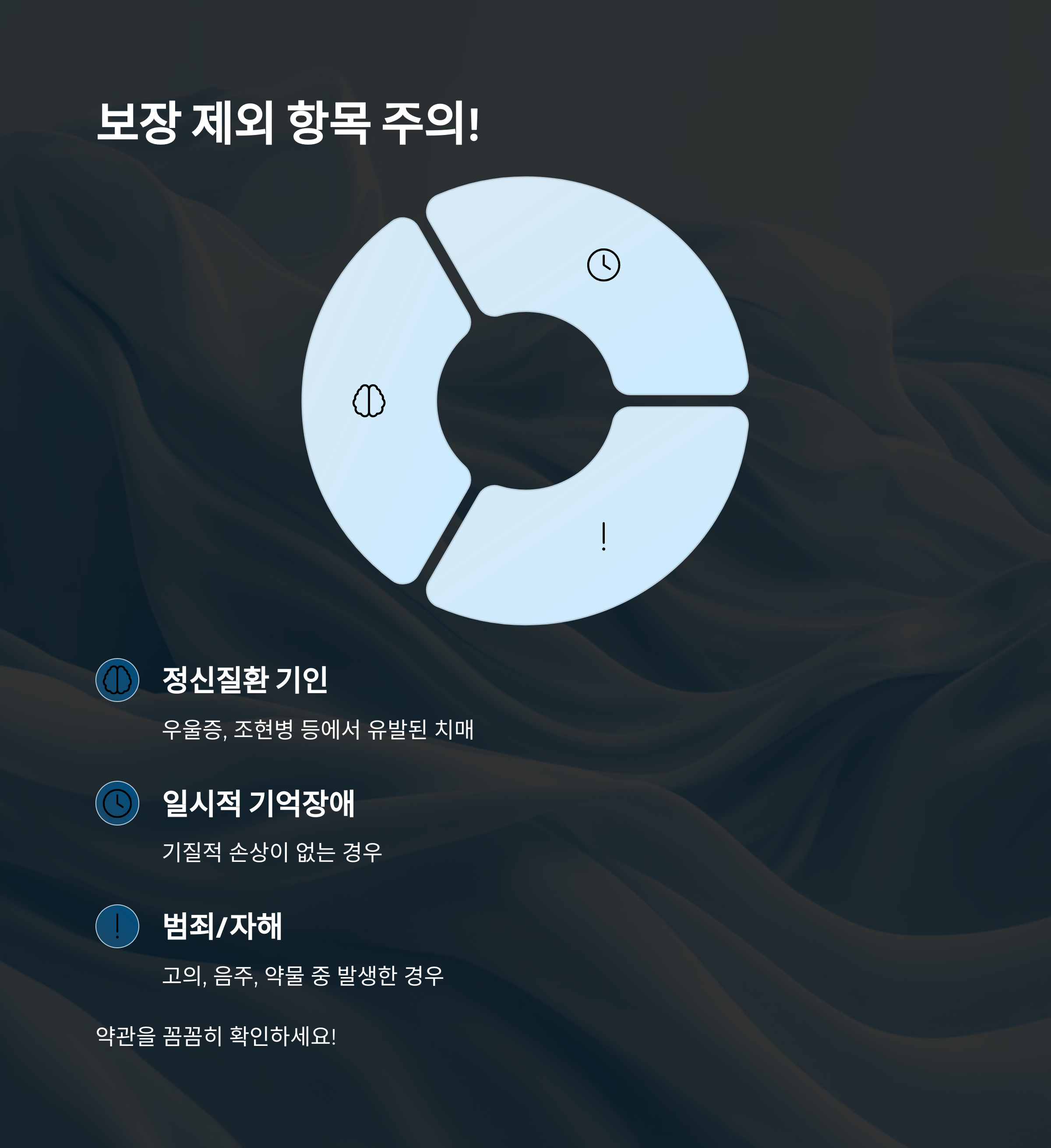또한 뇌 질환이 아닌 원인으로 인한 일시적 기억상실도 보험금 지급 대상이 아니에요. 이외에도 고의적인 자해나 범죄 행위 중 발생한 치매, 또는 음주 운전 등과 관련된 상황 역시 보장하지 않아요. 🚫
