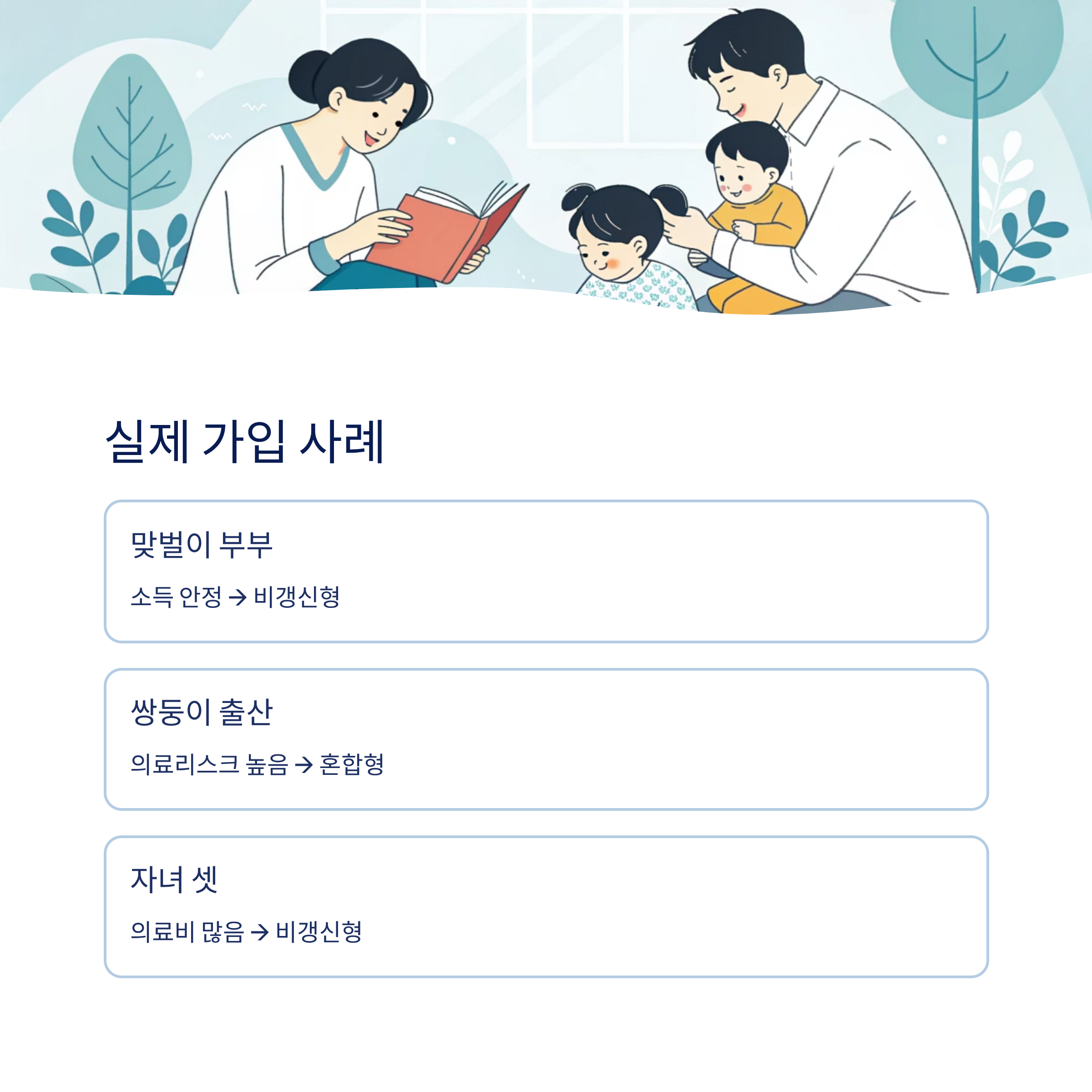 | D 부부 | 쌍둥이 출산 예정, 의료리스크 높음 | 혼합형(비갱신+갱신) |
