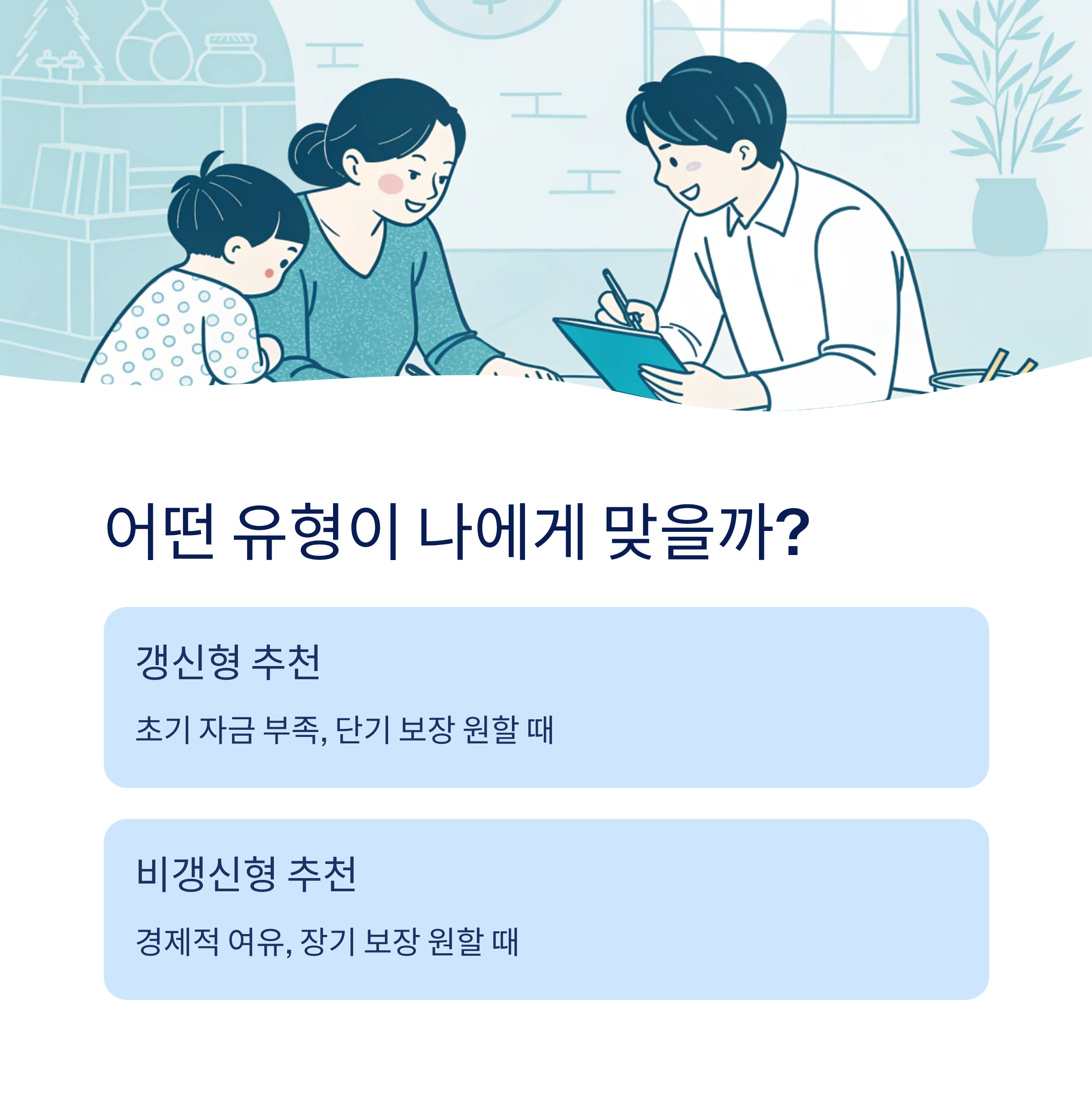 | B 부부 | 초기 자금 부족, 단기 보장 원함 | 갱신형 |