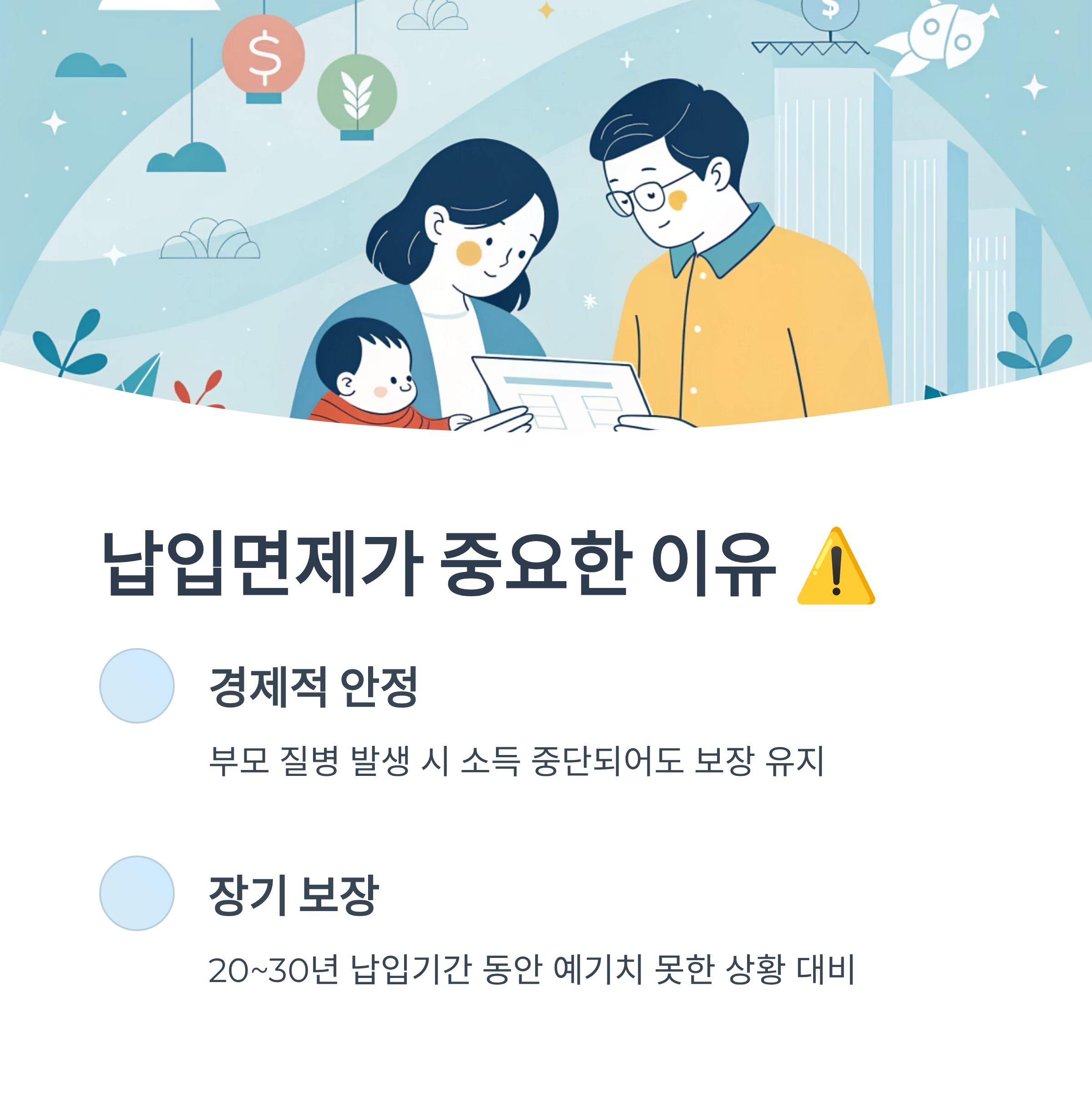 단, 어떤 보험이든지 '무조건 추천'은 어렵고, 각 가정의 건강 이력, 가족력, 소득 상황 등을 고려해서 설계받는 게 중요해요. 특히 상담 시 납입면제 조건이 특약인지 기본 보장인지 꼭 물어보는 습관을 들이면 좋아요.