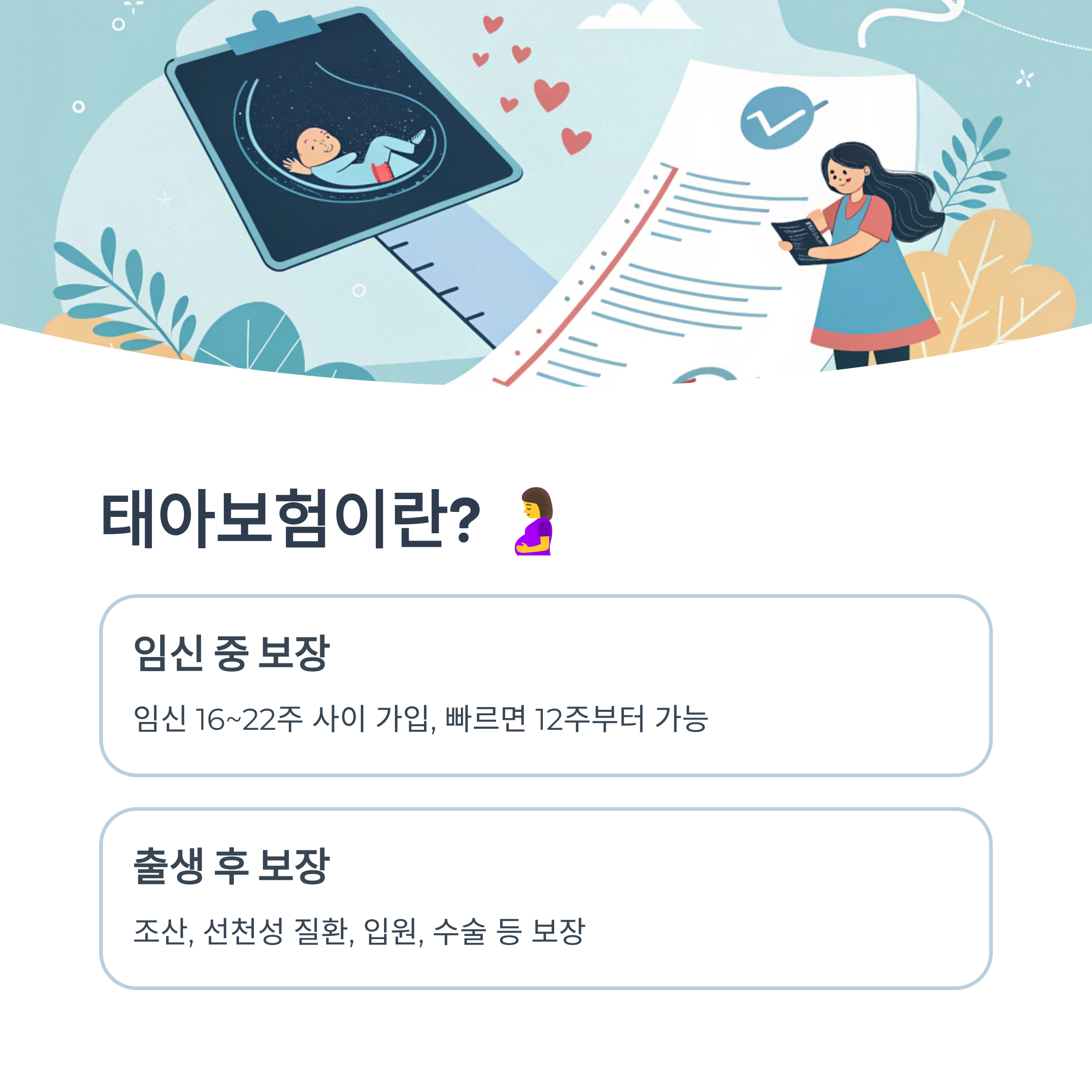 태아보험은 출산 전 임신 중부터 아기 출생 후까지 발생할 수 있는 질병, 상해, 입원, 수술 등에 대해 보장하는 보험이에요. 보통 임신 16주에서 22주 사이에 많이 가입하고, 빠르면 12주부터도 가능해요.