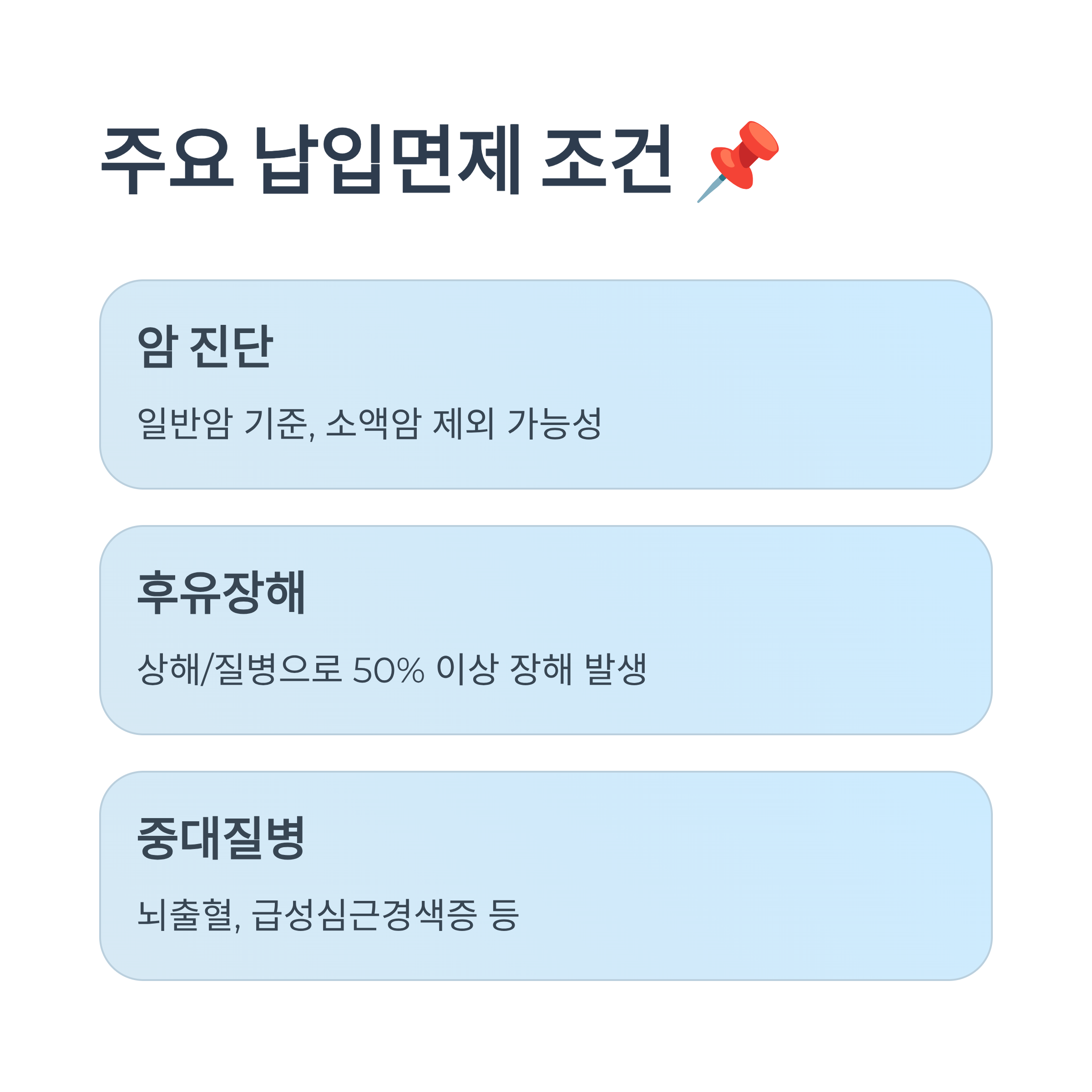 그리고 납입면제는 단순히 보험료를 면제받는 것뿐 아니라, ‘보장 유지’라는 점이 핵심이에요. 즉, 보험료를 더 이상 내지 않아도 입원, 수술, 질병 진단, 사고 등에 대해 기존과 동일한 보장을 받을 수 있다는 점에서 매우 중요하답니다.