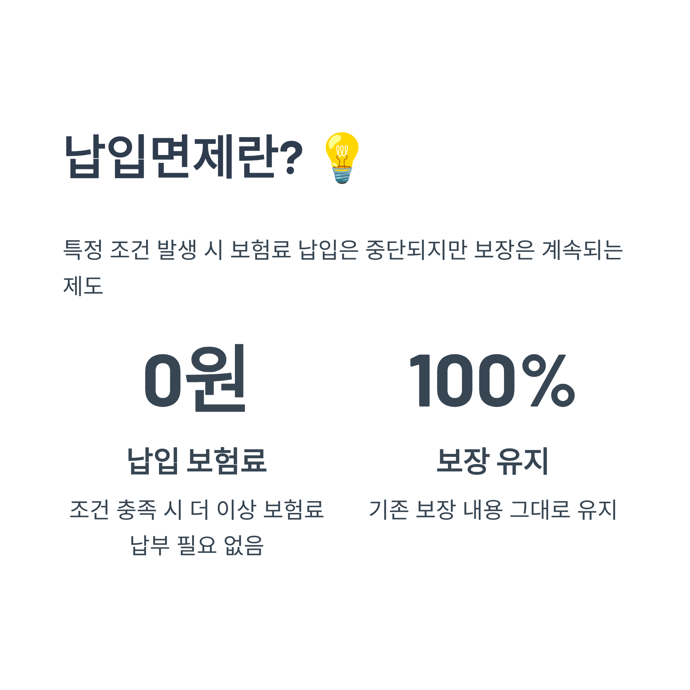 A4. 아니에요! 납입은 면제되지만, 보장은 그대로 유지돼요. 오히려 보험 혜택은 그대로 받으면서 더 이상 보험료를 내지 않아도 되는 구조예요.