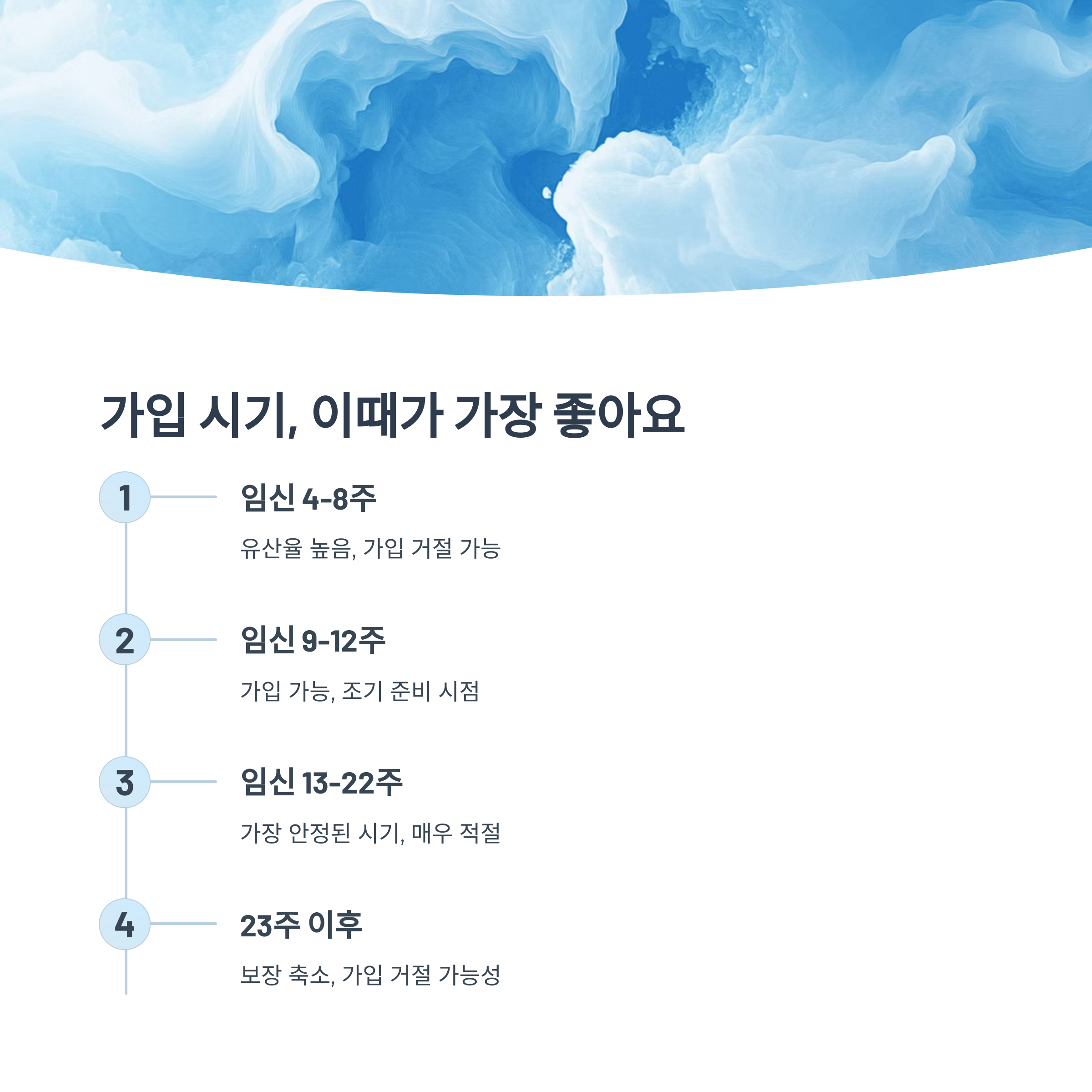 가입 시기는 빠를수록 유리하지만, 무조건 서두른다고 좋은 건 아니에요. 초기 유산율이 높은 임신 7~9주 이전에는 보험 가입을 피하는 것이 일반적이에요. 이 시기엔 안정기도 아니고 보험사에서도 리스크가 높다고 판단해서 보장을 거부할 수 있거든요.