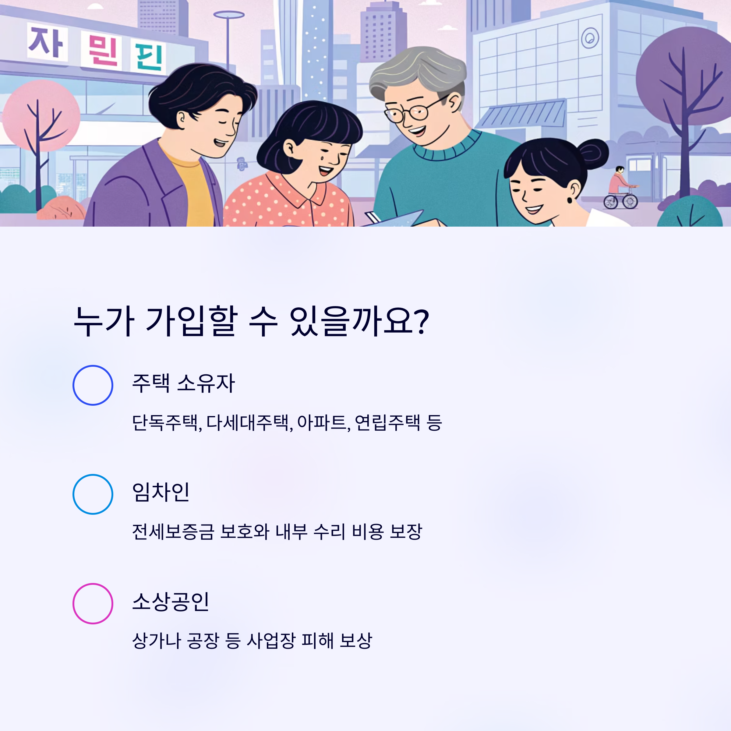 풍수해 보험은 특정 계층만 가입할 수 있는 제한된 제도가 아니에요. 주택을 소유하거나 임차 중인 일반 국민이라면 누구든지 가입할 수 있답니다. 즉, 소득 수준이나 지역 제한 없이 모든 사람이 대상이 된다는 것이 핵심이에요.