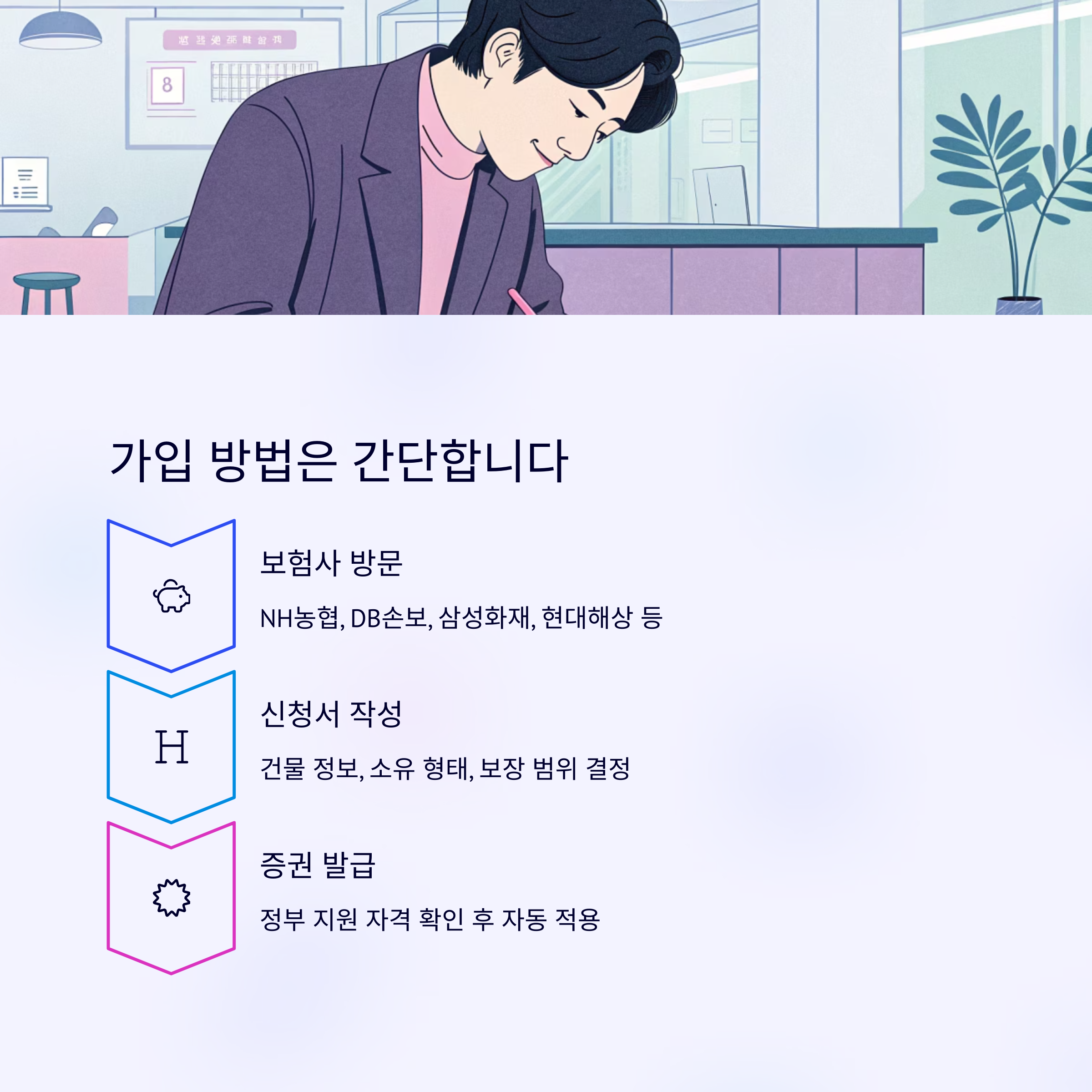가입을 원할 경우 기본적인 건물 정보, 소유 형태, 보장 범위, 원하는 보장 금액 등을 정한 후 신청서를 작성하면 돼요. 이때 정부 지원 대상 여부도 확인되며, 자격이 충족되면 보험료 감면 혜택이 자동으로 적용돼요.