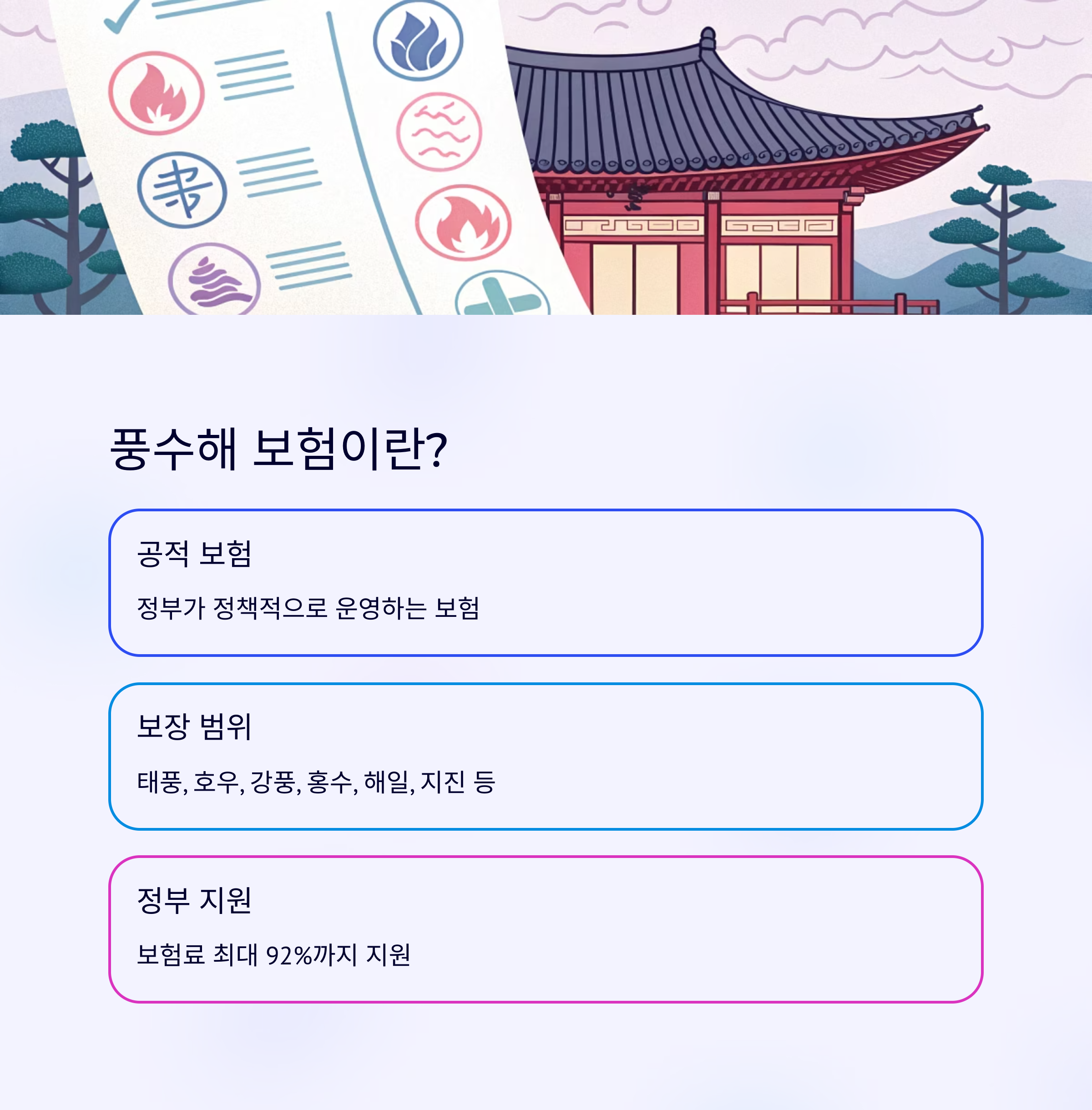 풍수해 보험은 태풍, 호우, 강풍, 홍수, 해일, 지진 등 자연재해로 인해 주택이나 건물이 피해를 입었을 경우 그 피해를 보상해주는 공적 보험이에요. 특히 정부가 정책적으로 운영하고 있어 보험료 일부를 지원받을 수 있다는 장점이 있어요.