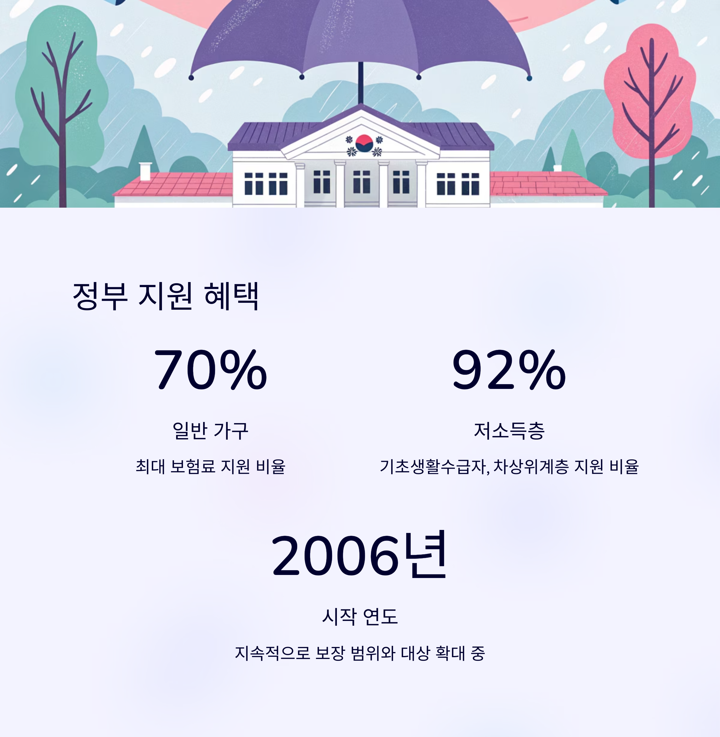 정부 지원금 덕분에 보험료 자체도 저렴한 편이에요. 일반 가입자의 경우 약 30~40% 수준의 자기부담금만 납부하면 되는데, 기초생활수급자나 차상위계층은 더 많은 금액을 정부가 보조해줘요.