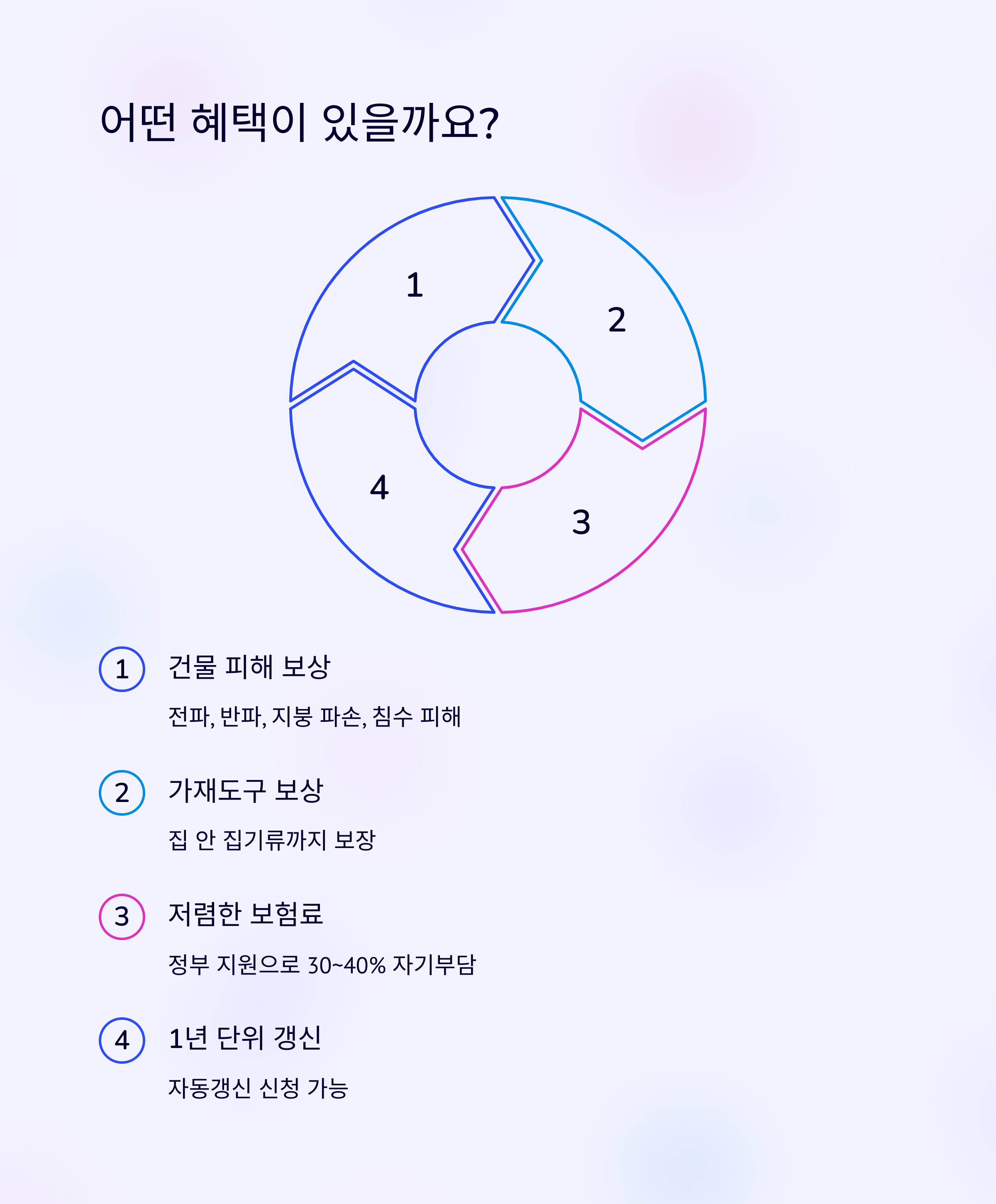 게다가 이 보험은 단순히 집이 파손된 경우만 해당하는 것이 아니라, 지붕 날림, 침수, 벽체 손상 등 생활 속에서 자주 발생할 수 있는 경미한 피해들도 보상 대상이 될 수 있어요. 보장 범위가 생각보다 넓다는 점도 중요해요.