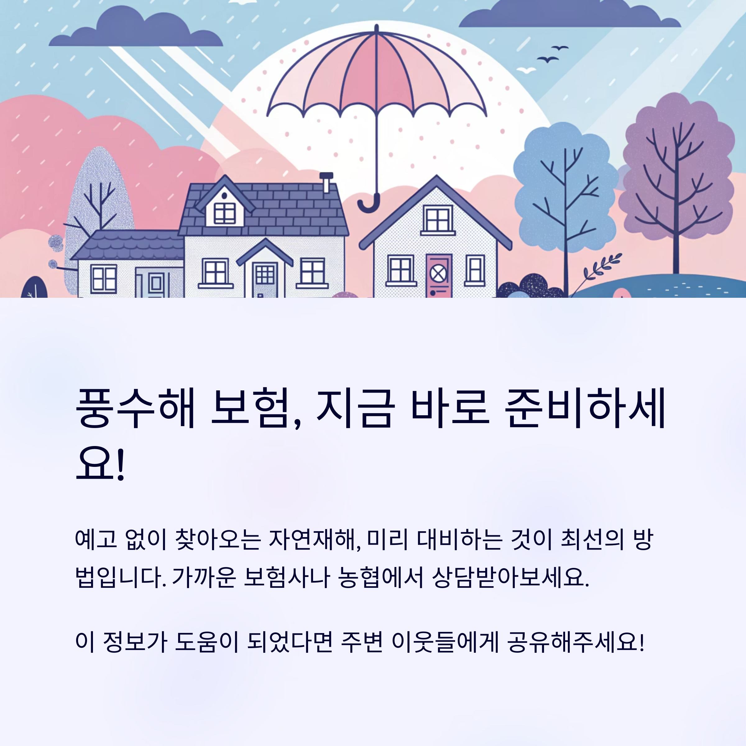 이처럼 풍수해 보험은 재해로 인한 손해를 최소화하고, 재정적 부담을 덜어주는 중요한 제도예요. 누구나 쉽게 가입할 수 있도록 설계되어 있는 만큼, 많은 분들이 관심을 가지면 좋겠어요.