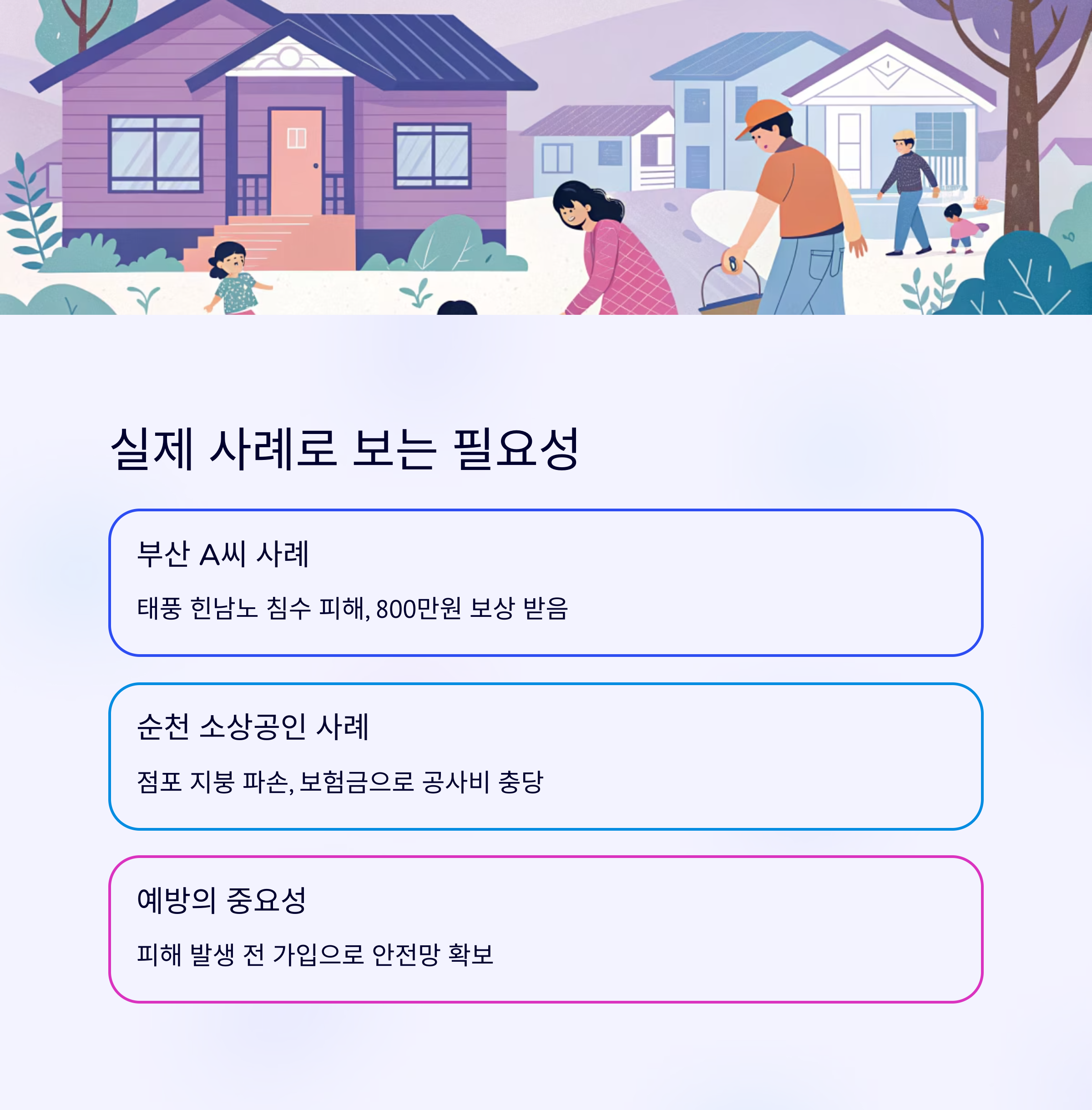 실제로 풍수해 보험에 가입해 큰 도움을 받은 사례들이 많아요. 부산에 사는 A씨는 작년 태풍 힌남노 때 주택이 침수되었지만, 보험 덕분에 약 800만 원의 보상을 받고 빠르게 복구할 수 있었어요.