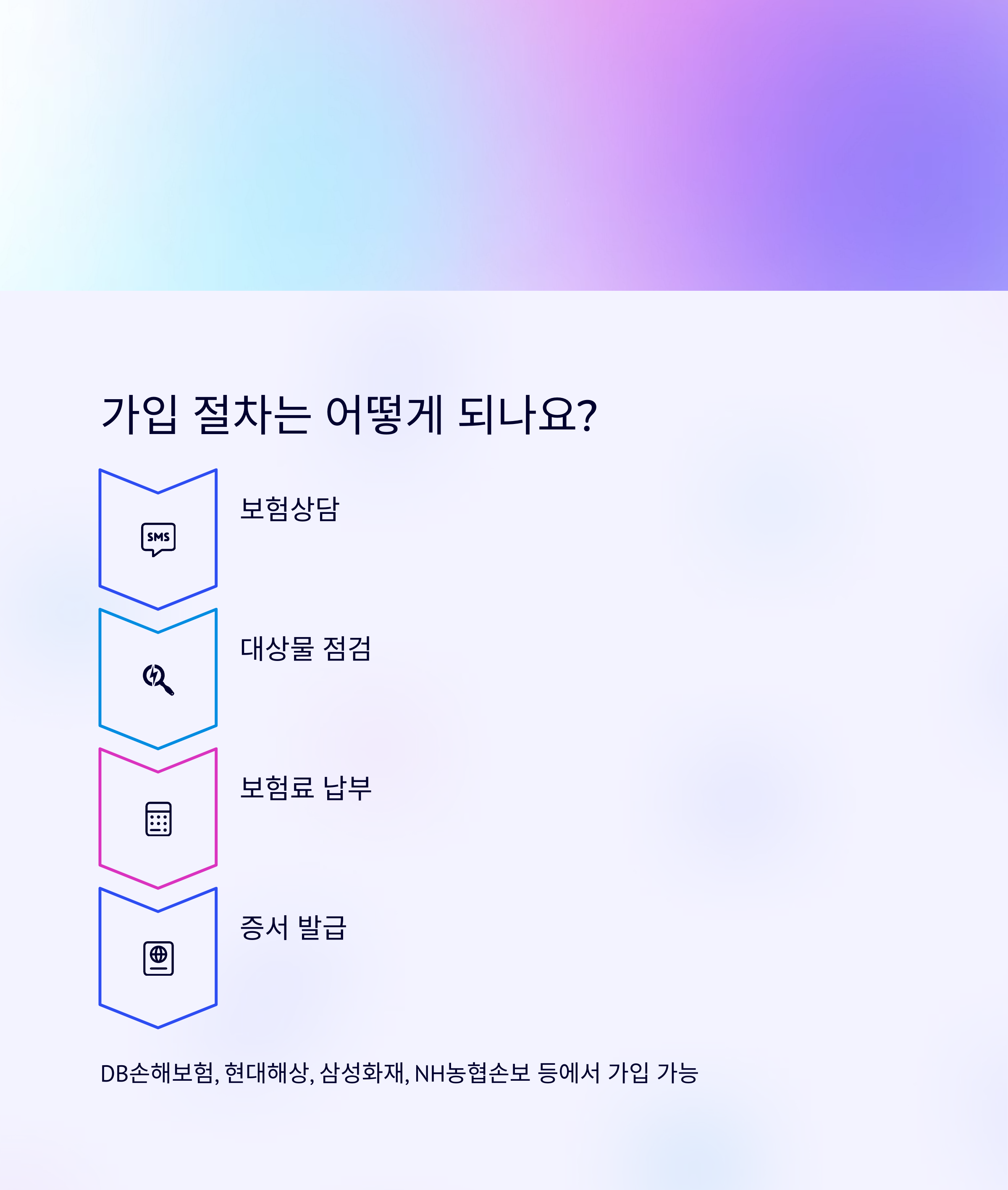 가입 절차는 크게 ① 보험상담 → ② 대상물 점검 및 견적 산출 → ③ 보험료 산정 및 납부 → ④ 보험 증서 발급으로 이루어져요. 일부 보험사는 비대면 가입도 가능하도록 간편한 온라인 시스템을 마련해두었답니다.