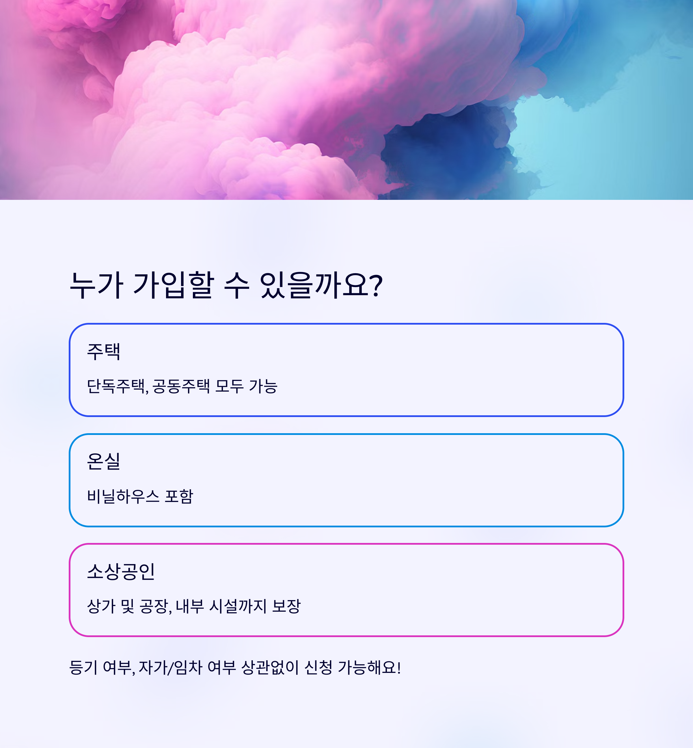 가입 조건은 건물의 등기 여부, 자가/임차 여부와 관계없이 신청이 가능하다는 점이 특징이에요. 임차인도, 소유주도 모두 신청할 수 있어요.