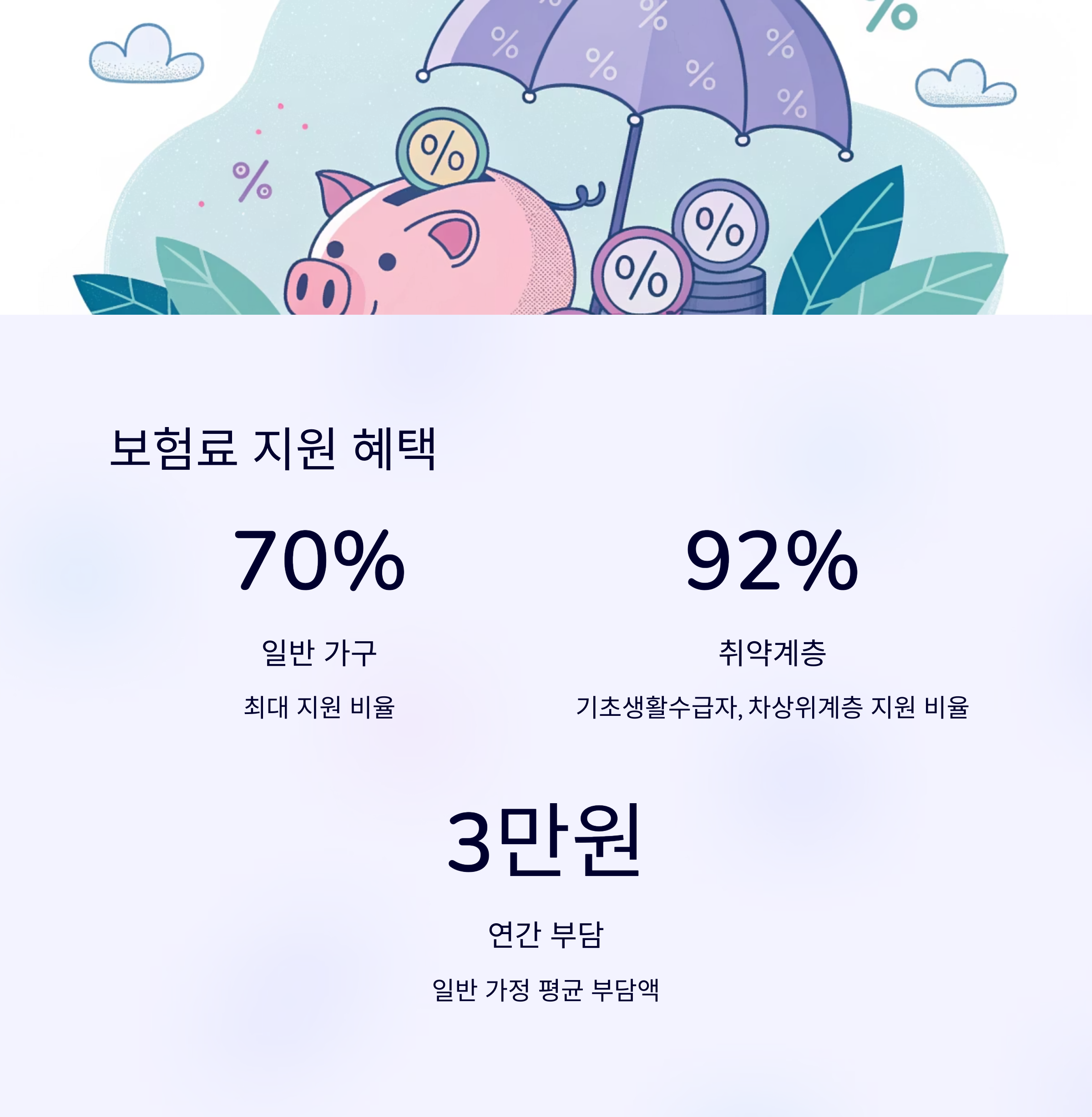 게다가 국가에서 보험료의 최대 92%까지 지원해주기 때문에 부담 없이 가입할 수 있어요. 특히 기초생활수급자, 차상위 계층은 거의 무료에 가까운 수준으로 보호받을 수 있답니다.