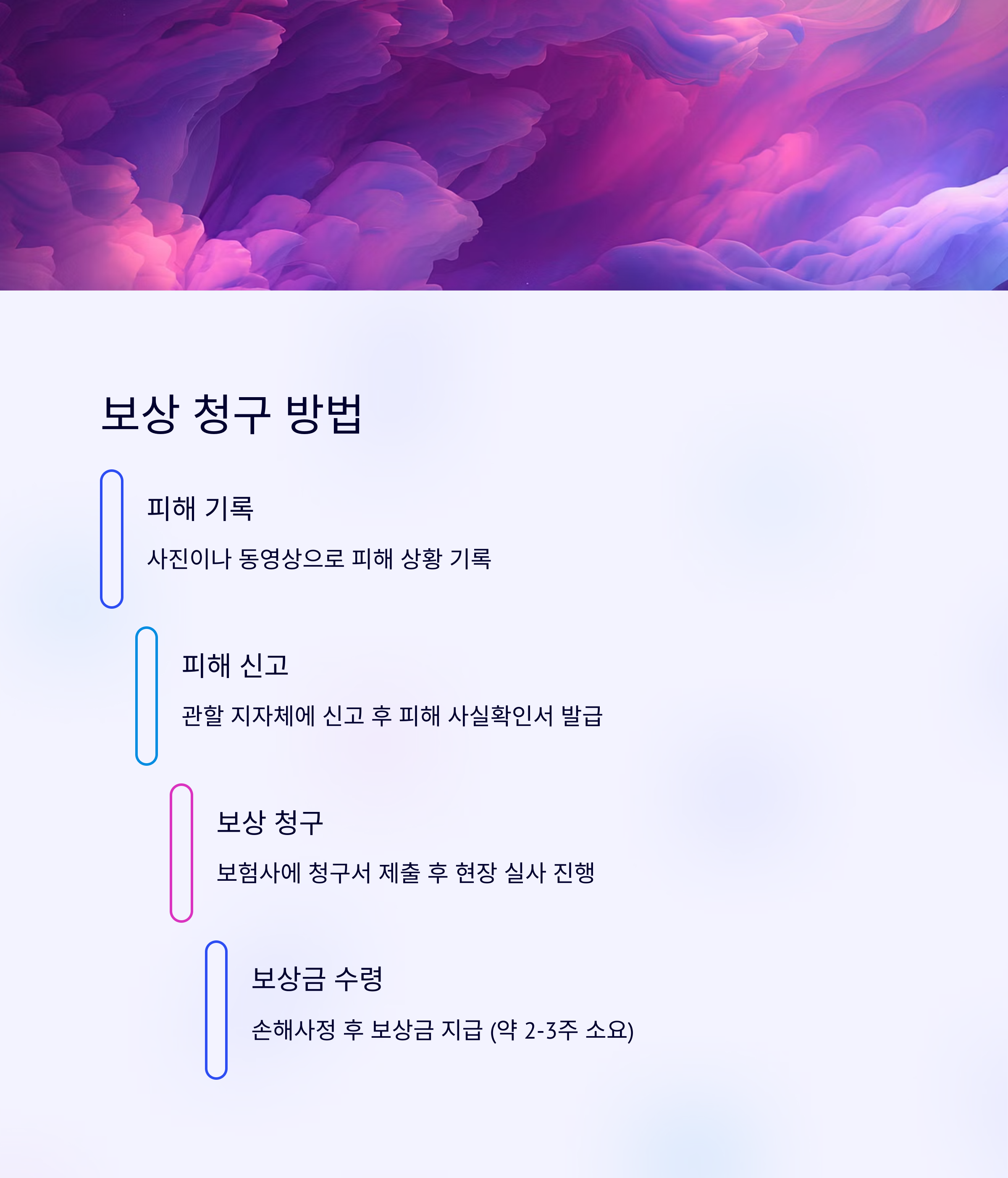 보험사에 보상 청구서를 제출하면, 현장 실사 후 손해사정이 이루어지고, 일정 금액이 산정되면 보상금이 지급돼요. 전체 과정은 보통 2~3주 정도 소요된다고 보면 돼요.