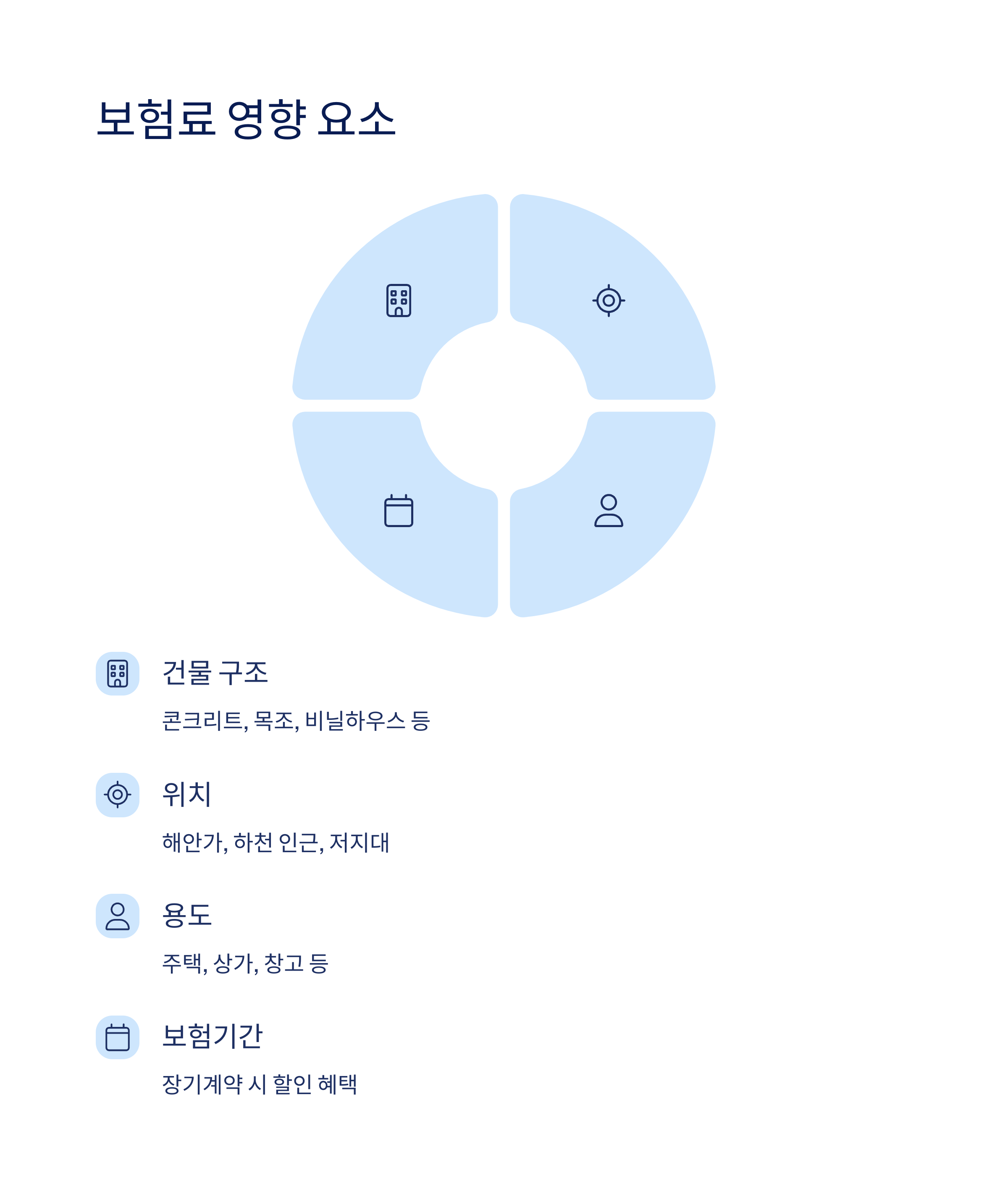 세 번째는 보험 대상의 용도예요. 같은 콘크리트 건물이라도 주택인지 상가인지, 혹은 창고인지에 따라 보험료가 달라져요. 일반적으로 공공출입이 많은 건물일수록 관리비용이 높다고 판단되어 위험률이 올라가요.