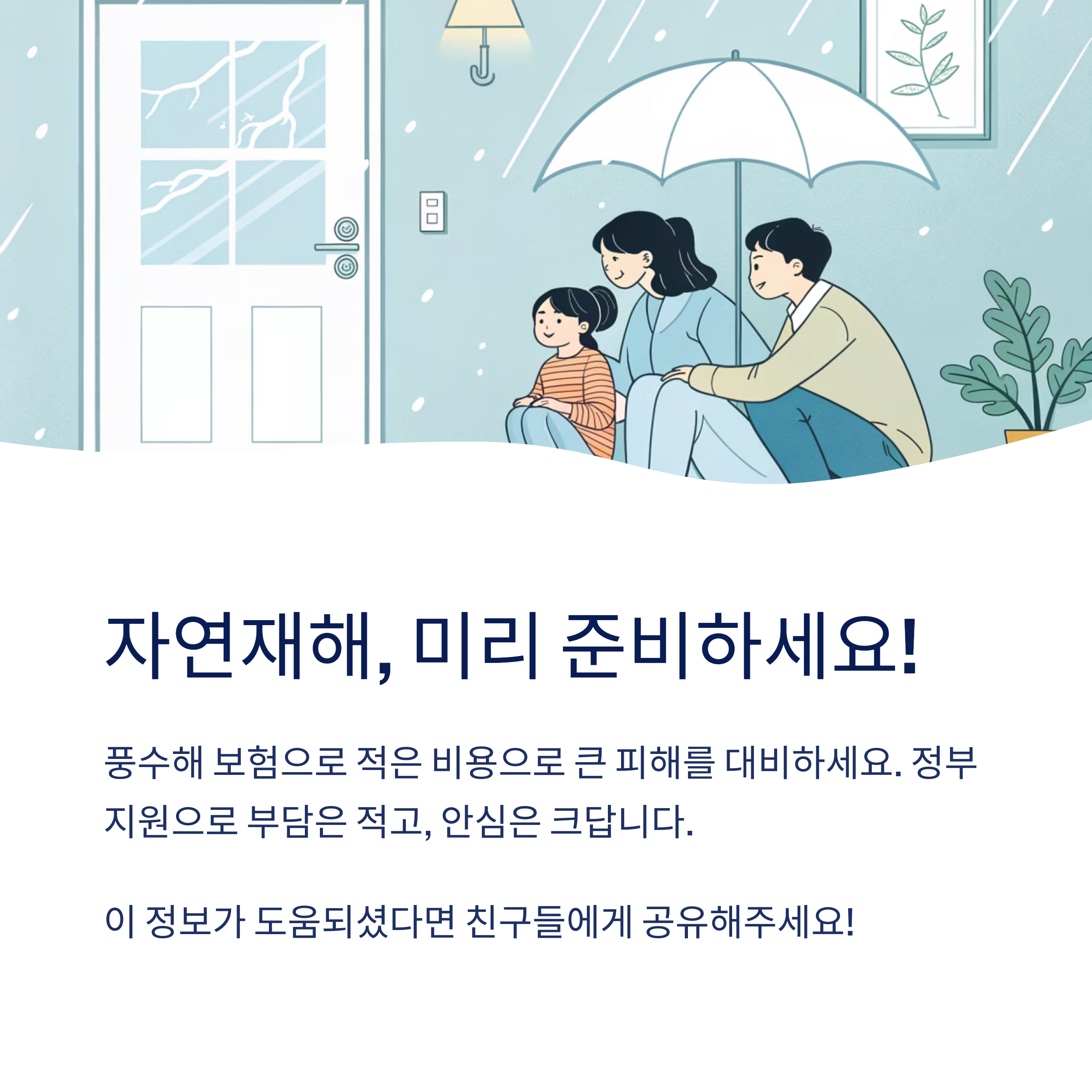 풍수해 보험은 단기적인 소비가 아니라 장기적인 재산 보호 수단이에요. 특히 자주 자연재해가 발생하는 지역이라면, 보험료 몇 만원이 아깝지 않은 선택이 될 수 있답니다!