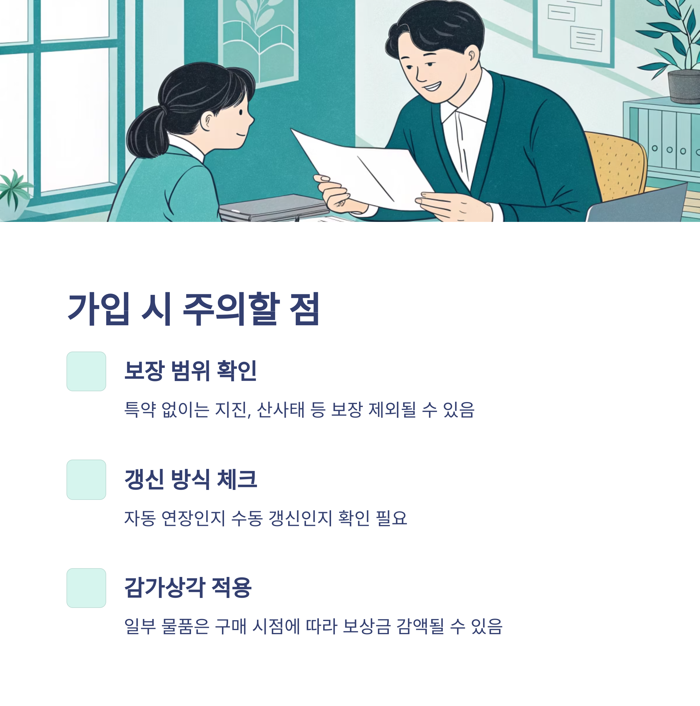풍수해 보험은 보장이 넓긴 하지만, 조건과 예외 조항도 많기 때문에 가입 전에 반드시 확인해야 해요. 예를 들어, 이미 낡고 파손된 물건은 보상 제외 대상이 될 수 있어요. 또한 보험금 지급 시 감가상각이 적용될 수 있다는 점도 유의해야 해요.